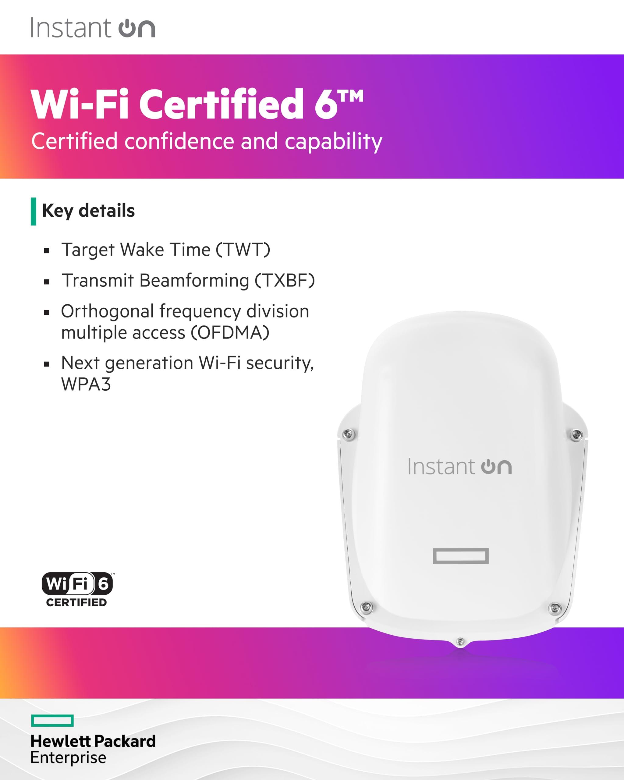 Punto di accesso HPE Networking Instant On AP27 2x2 WiFi 6 Punto di accesso wireless per esterni | Fonte di alimentazione non inclusa | Modello RW per il resto del mondo (S1T37A) Porta la tua attività all'aperto con Instant On AP27. Questo punto di accesso certificato Wi-Fi 6 è classificato IP67 e fornisce protezione da polvere e umidità nelle condizioni più difficili. In grado di resistere a temperature comprese tra -40 °F e 149 °F, questo punto di accesso esterno ad alta velocità ti manterrà connesso durante estati calde, inverni gelidi, pioggia, nevischio e neve. Connetti fino a 75 dispositivi tramite Wi-Fi 6 per estendere la copertura a parcheggi, spazi di lavoro all'aperto e piscine di hotel