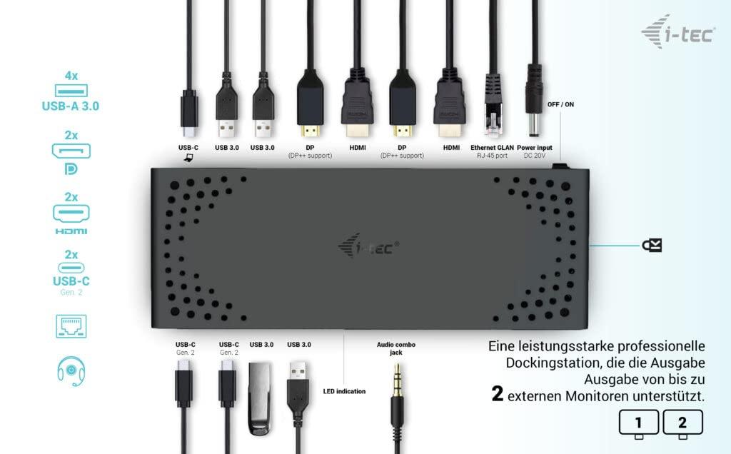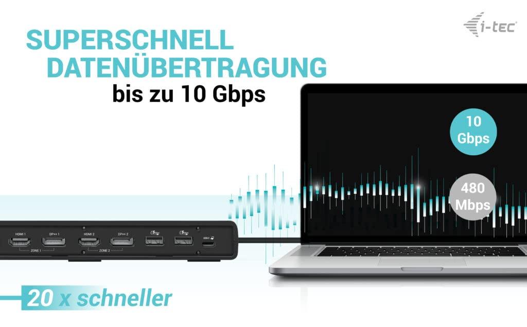 - Docking station universale compatibile con laptop e tablet USB-C, USB-A e Thunderbolt. 2x DisplayPort e 2x HDMI che supportano fino a due display 4K/60Hz (valido anche per la piattaforma Apple M1/M2) o un display 5K/60Hz. 6 porte USB, tra cui 4 porte USB-A 3.0 (1 ricarica rapida BC 1.2) e 2 porte USB-C Gen2 (10 Gbps), che consentono di collegare facilmente diversi dispositivi e periferiche USB per un trasferimento dati molto veloce