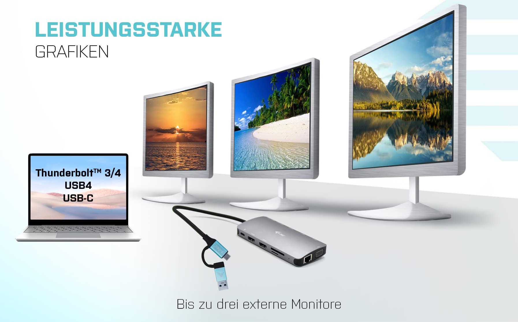 - Il dock è compatibile con quasi tutti i computer portatili attuali (collegamento tramite porte USB 3.0, USB-C, USB4 o Thunderbolt 3/4)