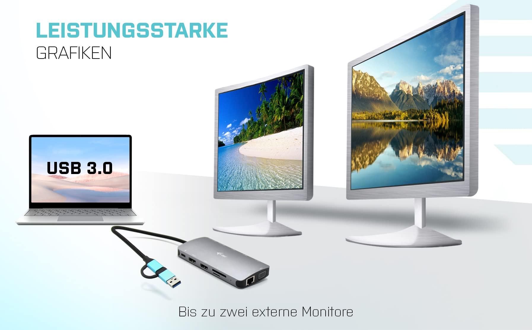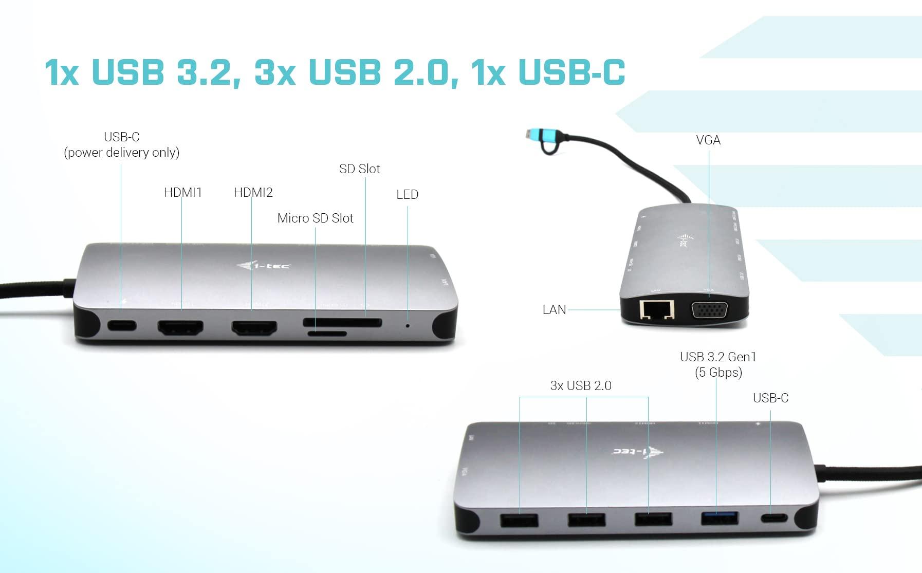 I-TEC USB-C Metal Nano Dock 2xHDMI 1xVGA 1xSD Cardreader 1xmicroSD Cardreader 1xGLAN 3xUSB 2.0 1xUSB 3.2 1xUSB-C3.2Data 1xUSB-C PD