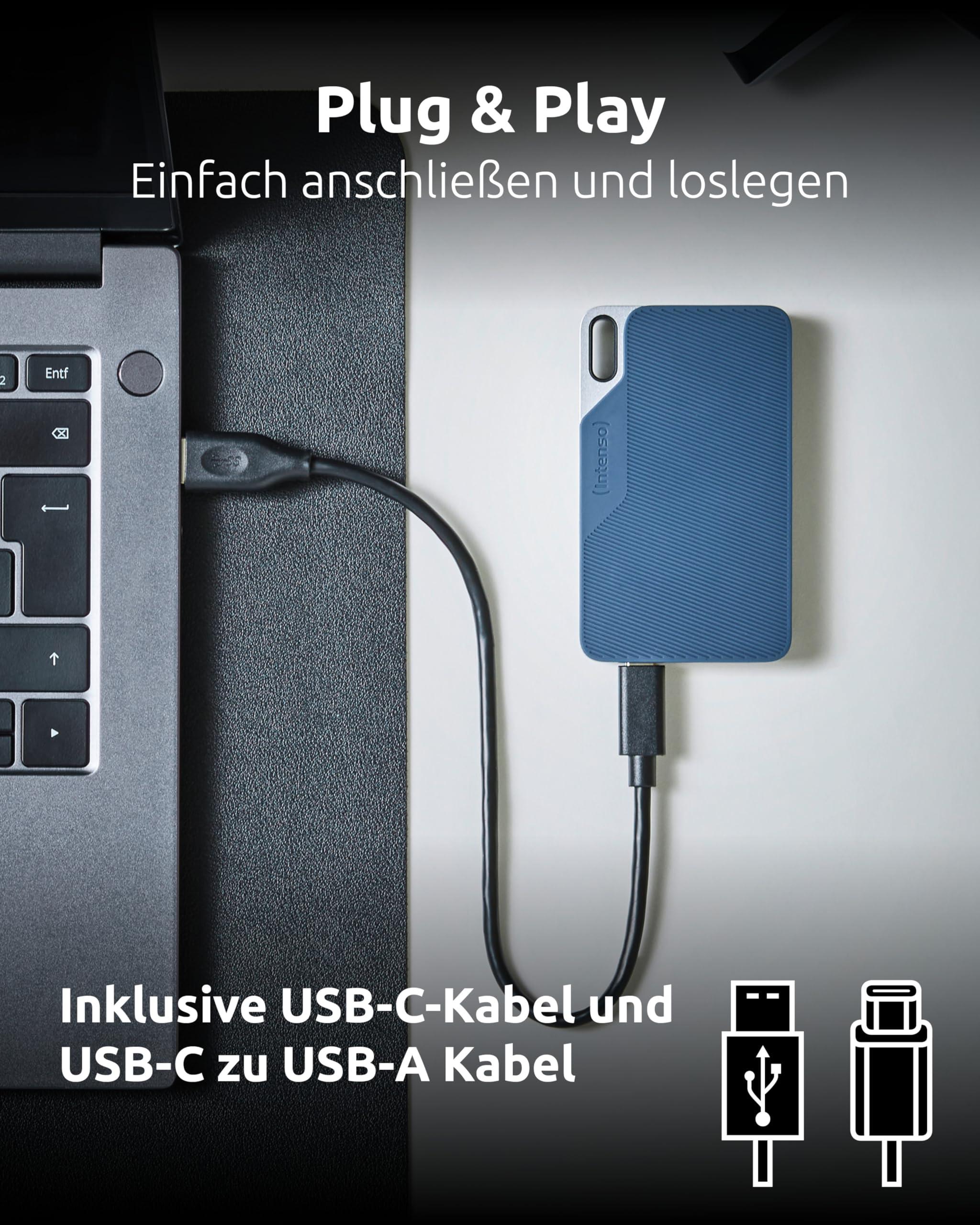 - Contenuto della confezione: esterno Intenso SSD TX100, cavo USB-C, cavo USB-C a USB-A, manuale di istruzioni