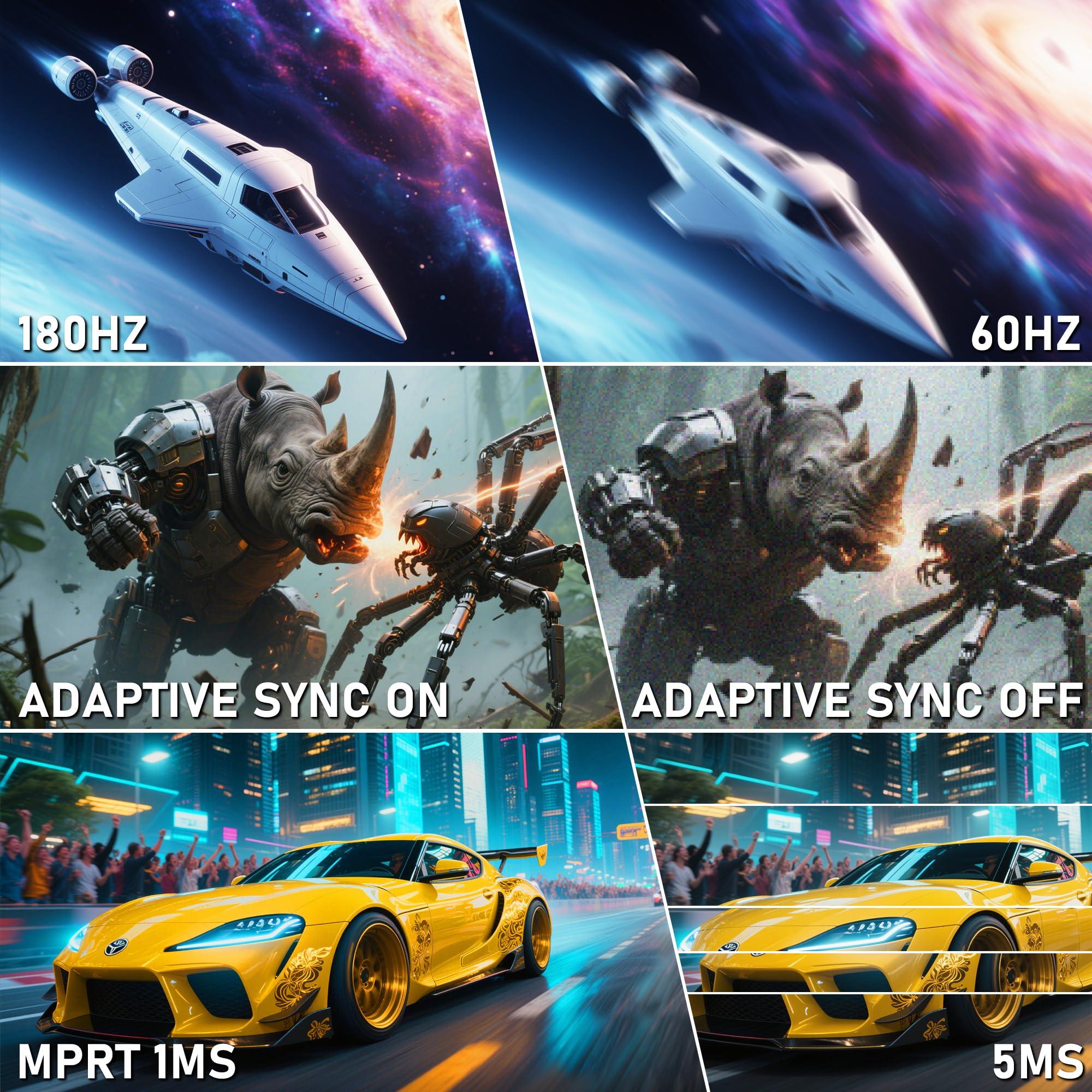 - Divertimento fluido a 180 Hz: la risposta MPRT di 1 ms con 180 Hz offre il massimo supporto ai giochi. L'Adaptive Sync aiuta a evitare tearing, stuttering e lag. Grazie alle impostazioni integrate per i giochi FPS, racing o RTS, è possibile passare liberamente da un gioco all'altro e godere di un'esperienza di gioco rilassante!