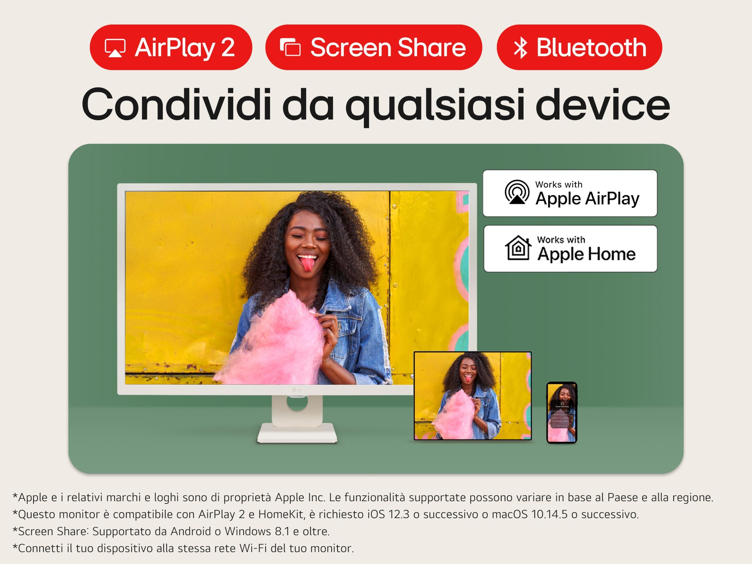 - CONDIVISIONE CON AIRPLAY E SCREEN SHARE: grazie a Wi-Fi e Bluetooth puoi collegare il tuo smartphone o tablet e guardare sul monitor in tutta semplicità i tuoi contenuti preferiti tramite AirPlay (per dispositivi Apple) o Screen Share (per dispositivi Android).
