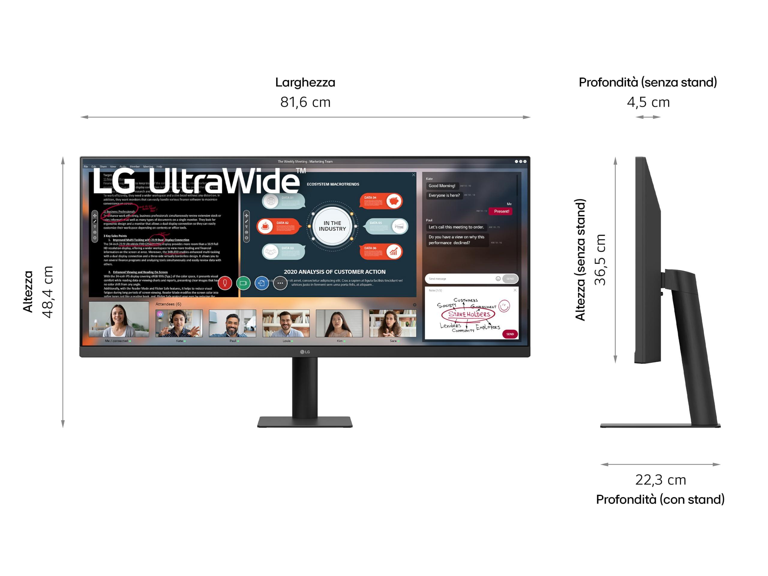 LG 34U511A Monitor UltraWide 21:9 34" IPS, WFHD (2560x1080), HDR 400, 100Hz, sRGB 99%, HDMI, DisplayPort, Uscita Cuffie, Schermo Antiriflesso, Reader Mode, Flicker Safe, Nero