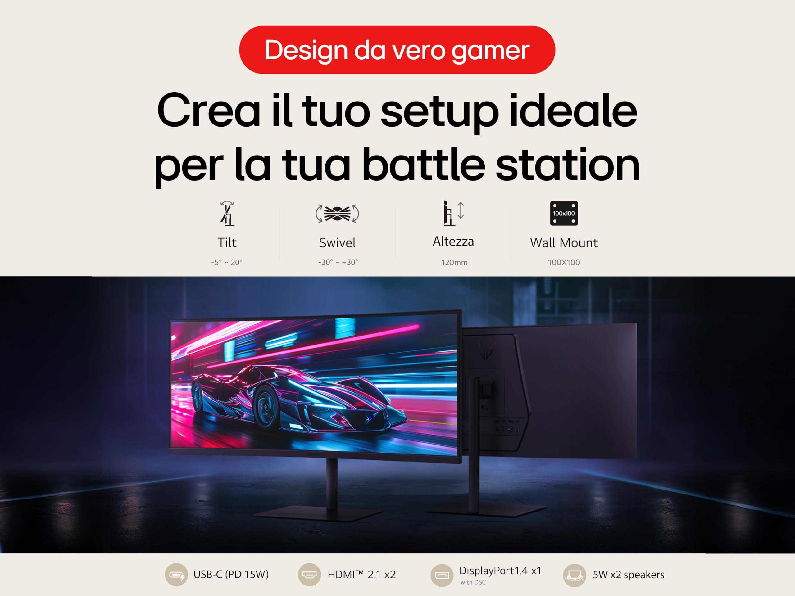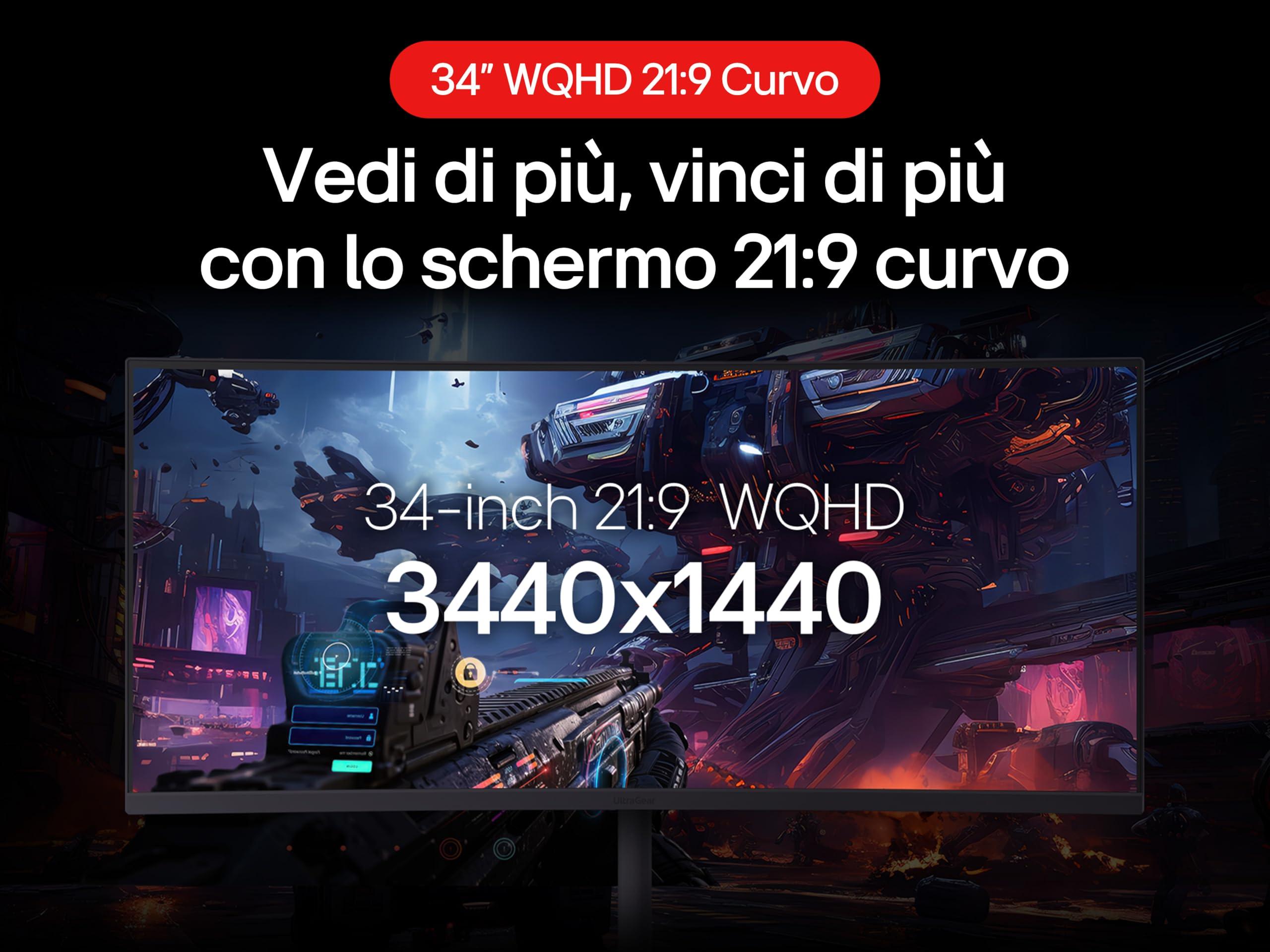 - MONITOR GAMING 34" CURVO: gioca su un ampio display 21:9 da 34" e immergiti nelle tue partite. La curvatura da 1800R su formato 21:9 assicura massimo coinvolgimento senza distorcere le immagini
