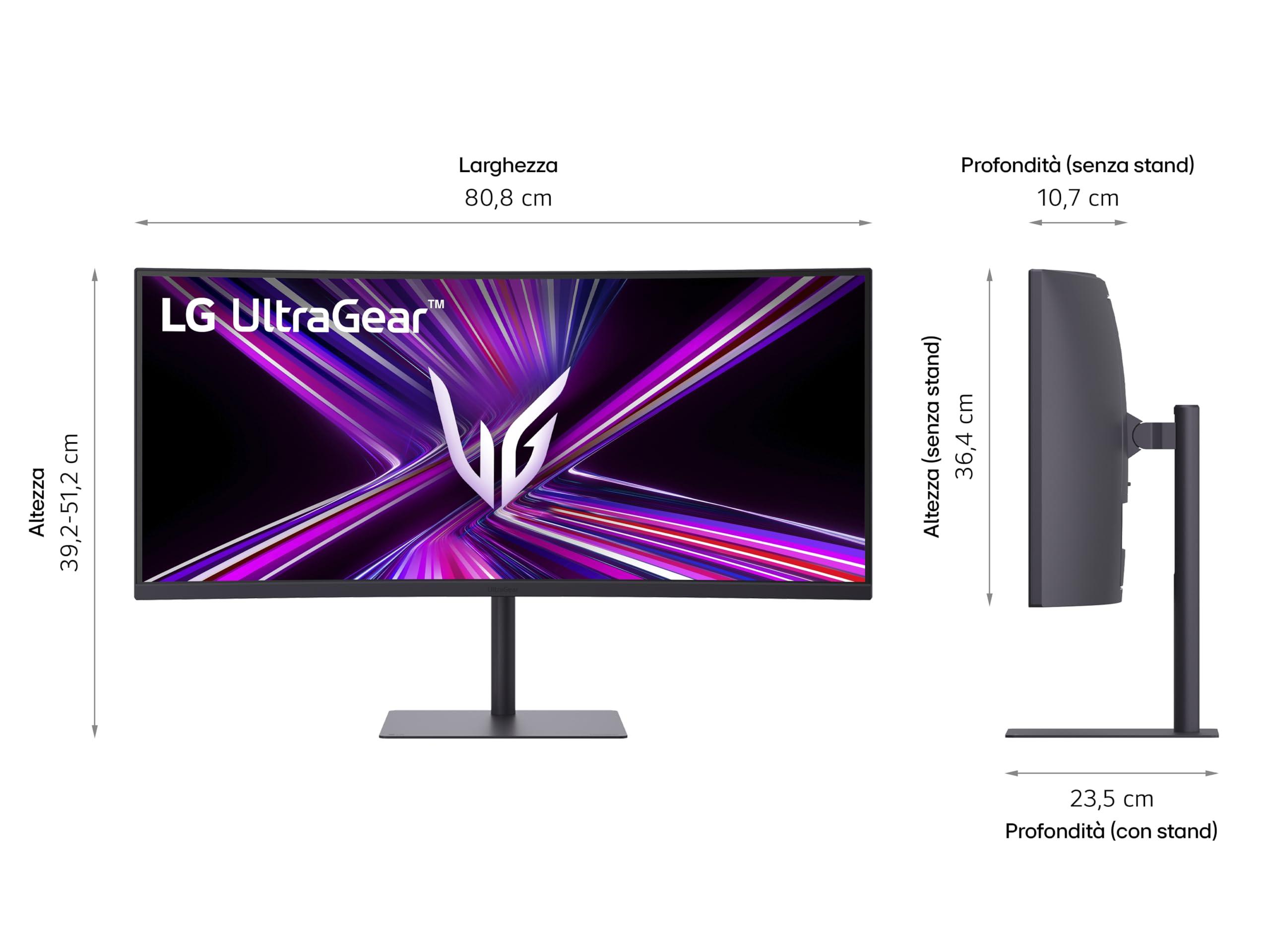 LG UltraGear 34G630A Monitor Gaming 34" 21:9 Curvo WQHD (3440x1440), 240Hz, 1ms (GtG), AMD FreeSync Premium, VRR, HDR 400, Speaker Stereo 10W, USB-C (15W), HDMI, DP, Hub USB, AUX, 2PBP, PIP, Nero