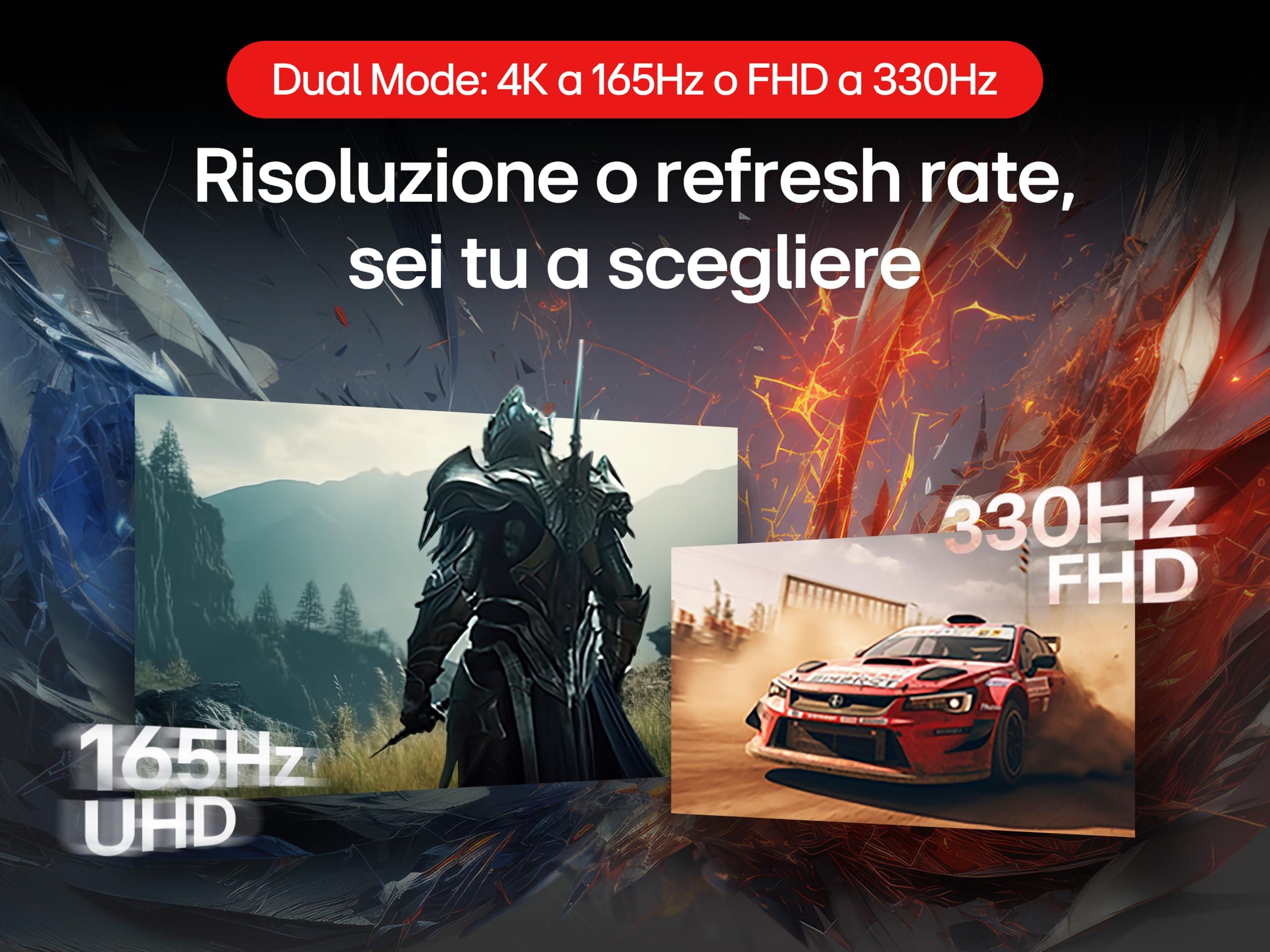 - 4K 165Hz / FHD 330Hz: scegli la migliore configurazione di frequenza e risoluzione in base a cosa stai giocando. Puoi giocare in 4K a 165Hz per immagini mozzafiato, o in FHD a 330Hz per reattività estrema, semplicemente premendo il tasto Dual Mode
