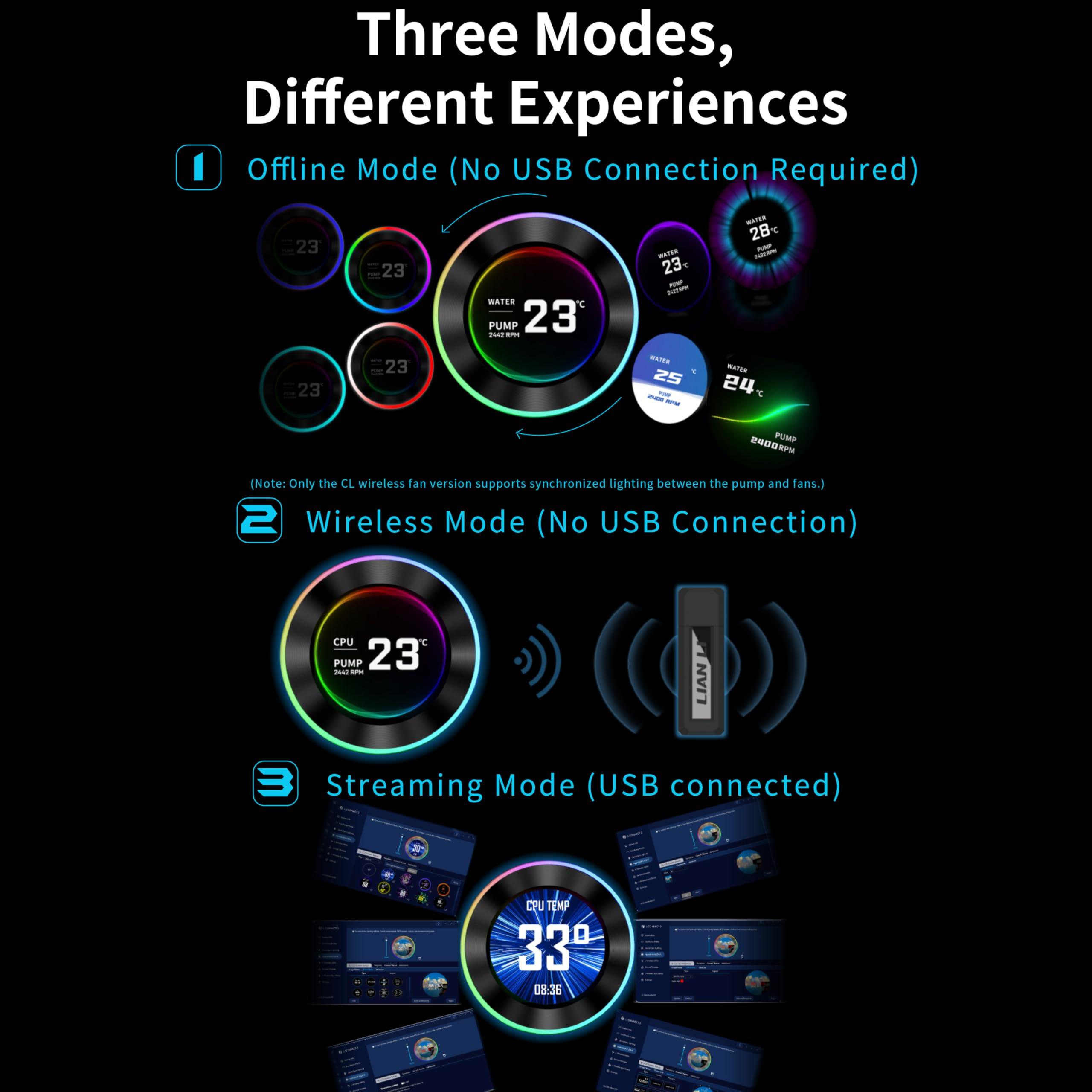 - (1) Modalità offline: Regola il contenuto LED e LCD utilizzando un tappo girevole senza connessione USB, visualizzando la temperatura del liquido di raffreddamento e il seme della pompa. (2) Modalità wireless: regola le informazioni hardware dello schermo, i temi di sfondo e gli effetti di illuminazione dei tappi in modalità wireless con il controller L-Wireless durante la sincronizzazione con altri dispositivi wireless LIAN LIAN. (3) Modalità Streaming: Connessione tramite USB per personalizzare completamente le impostazioni utilizzando il software L-Connect 3, supportando vari formati multimediali come MP4 e GIF per display personalizzati.