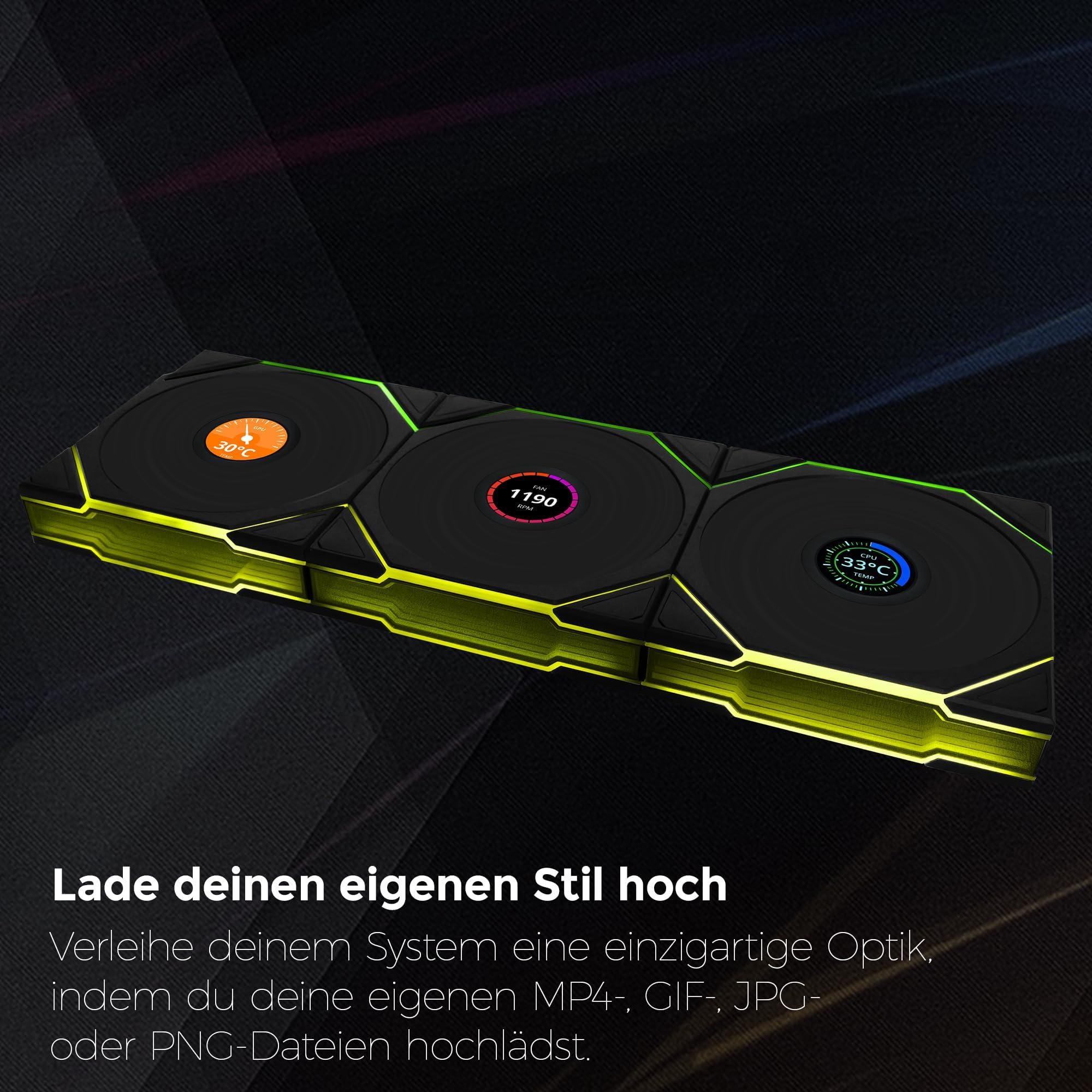 - VENTOLINE DI ALTA QUALITÀ DA 120 MM: Ventole PC nere durevoli con telaio in plastica PBT e PA66, che conferiscono al tuo setup RGB PC un aspetto moderno grazie al display LCD e allo specchio dell'infinito.'