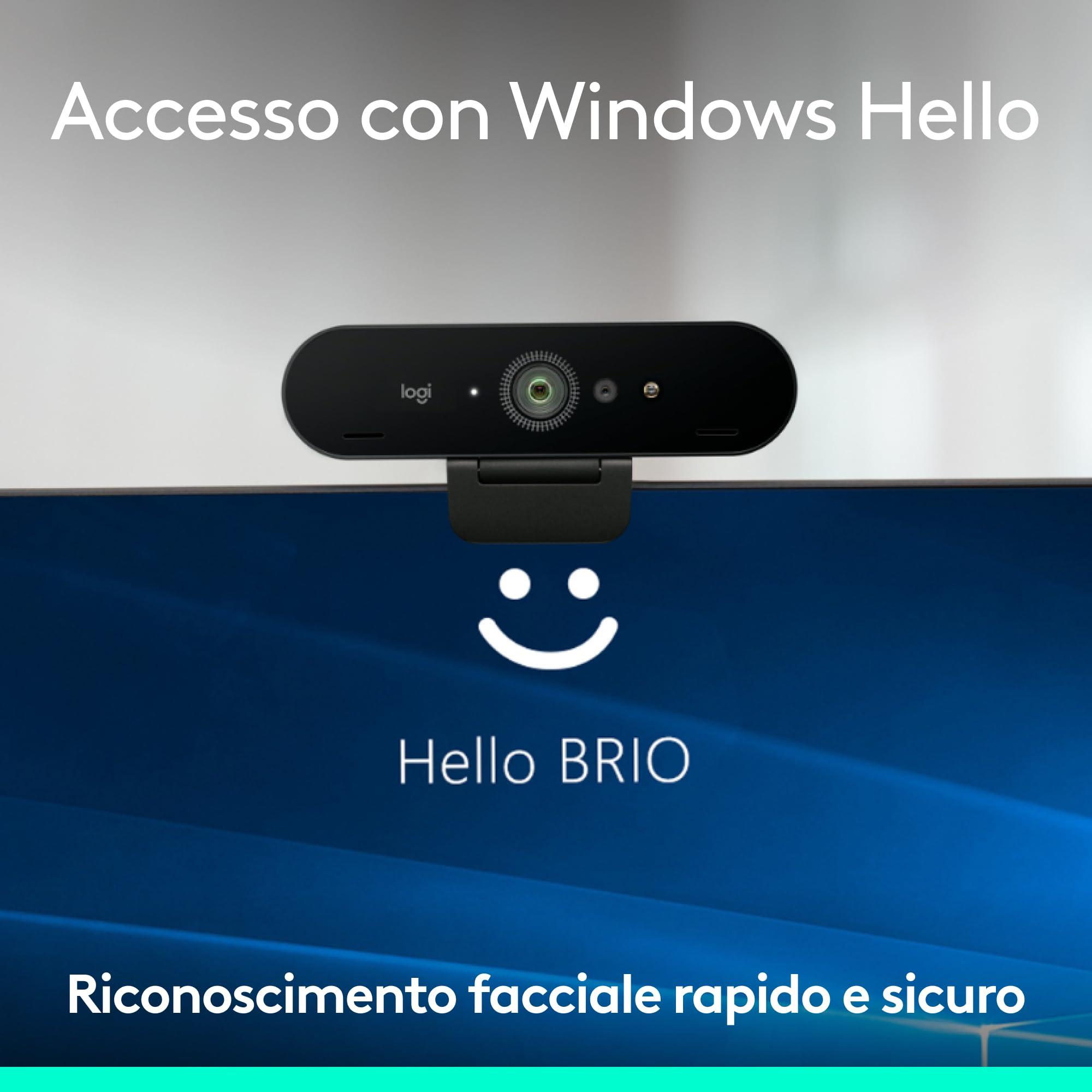 - Supporto di Windows Hello: grazie a sensori ottici e a infrarossi, Brio 4K consente il riconoscimento facciale rapido e sicuro per Windows Hello; è sufficiente guardare nell'obiettivo della webcam per accedere a Windows