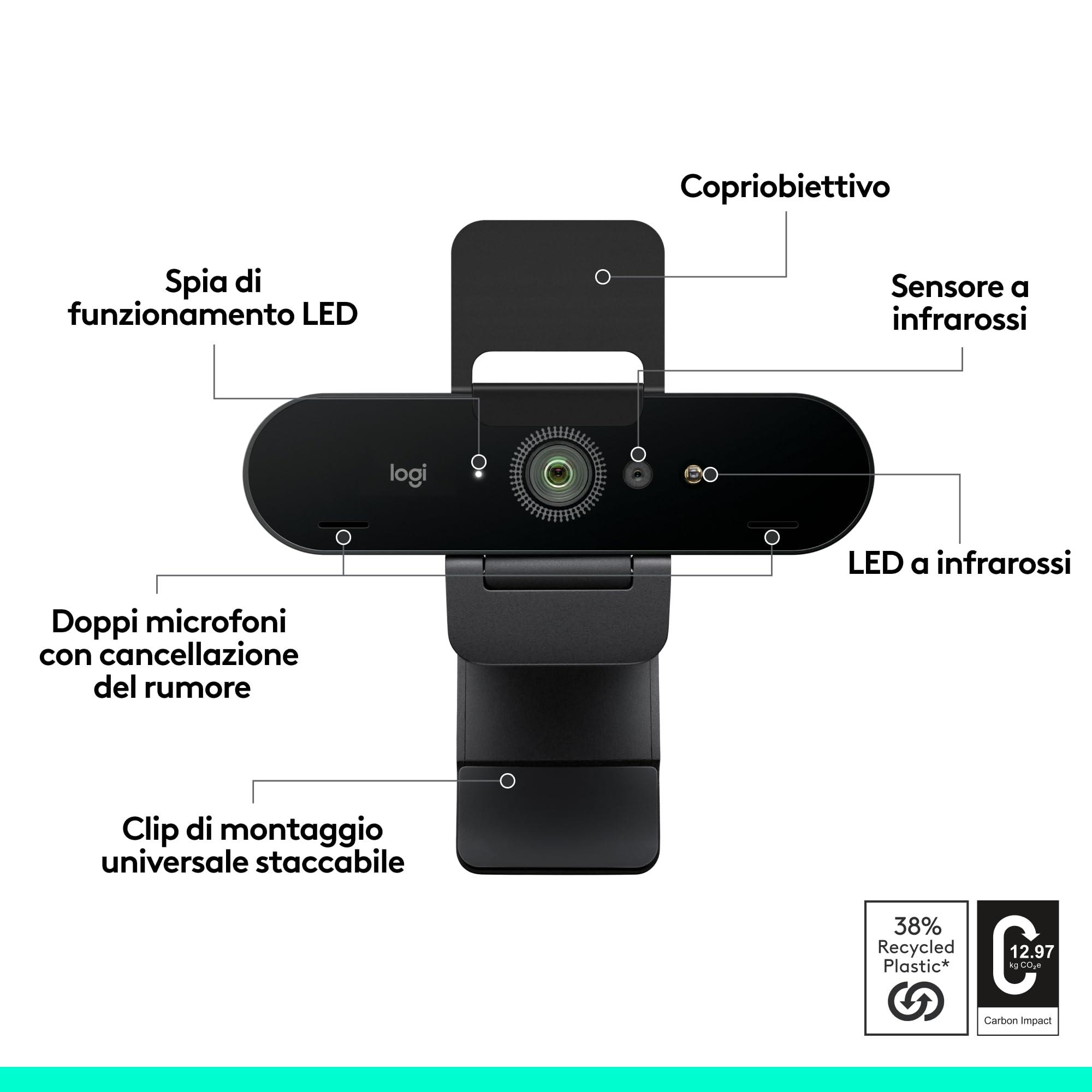 Logitech Brio 4K webcam, videochiamate, microfono con cancellazione del rumore, correzione automatica dell'illuminazione HD, per Microsoft Teams, Zoom, Google Voice, Google Meet, PC/Mac/Laptop/Macbook