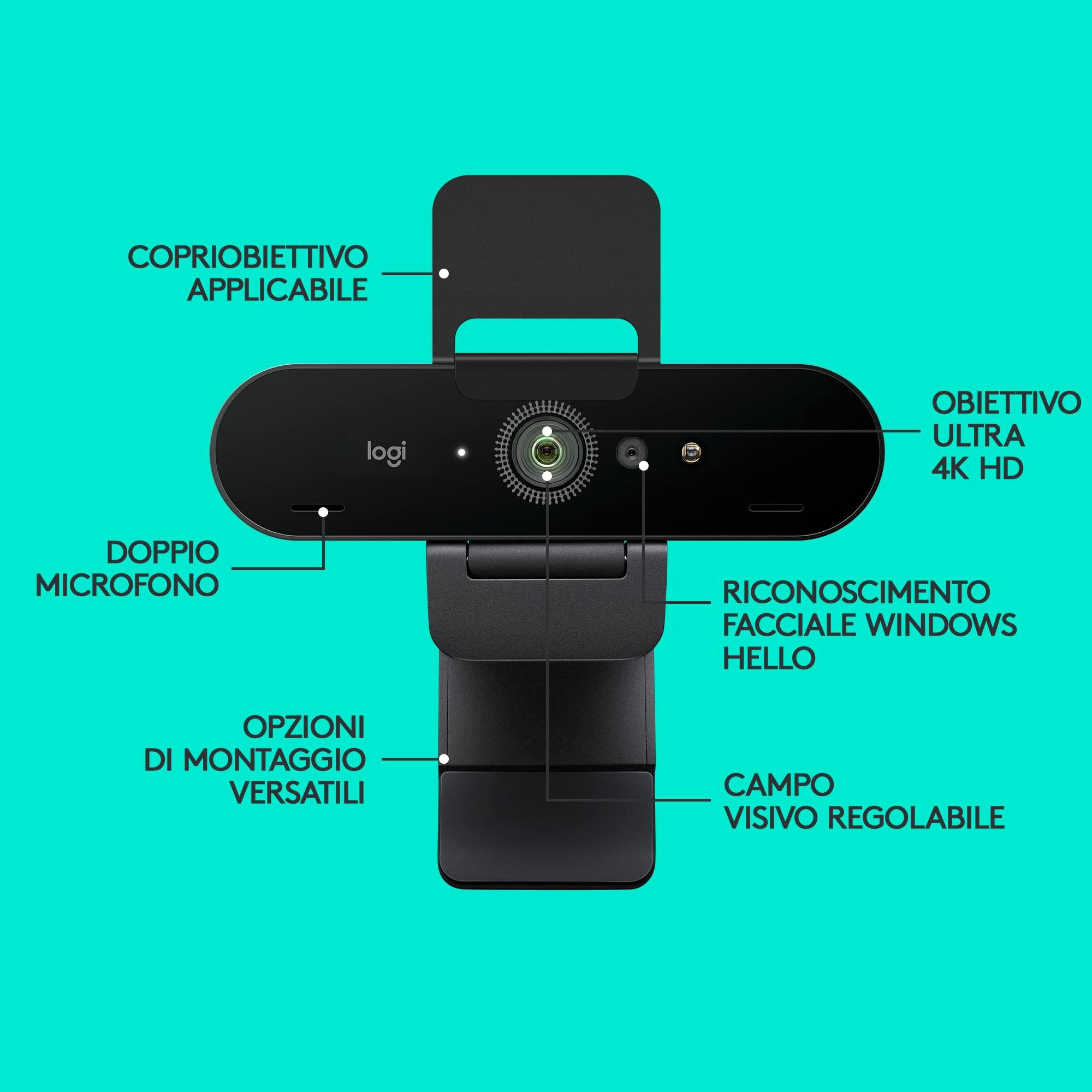 Logitech Brio Ultra HD Pro Webcam, Streaming Hyper-Fast 1080p/60fps, Ampio Campo Visivo Regolabile, Zoom 5X, Funziona con Skype, WebEx, Cisco Jabber, Zoom, Windows Hello, PC/Mac/Laptop/Chrome - Nero