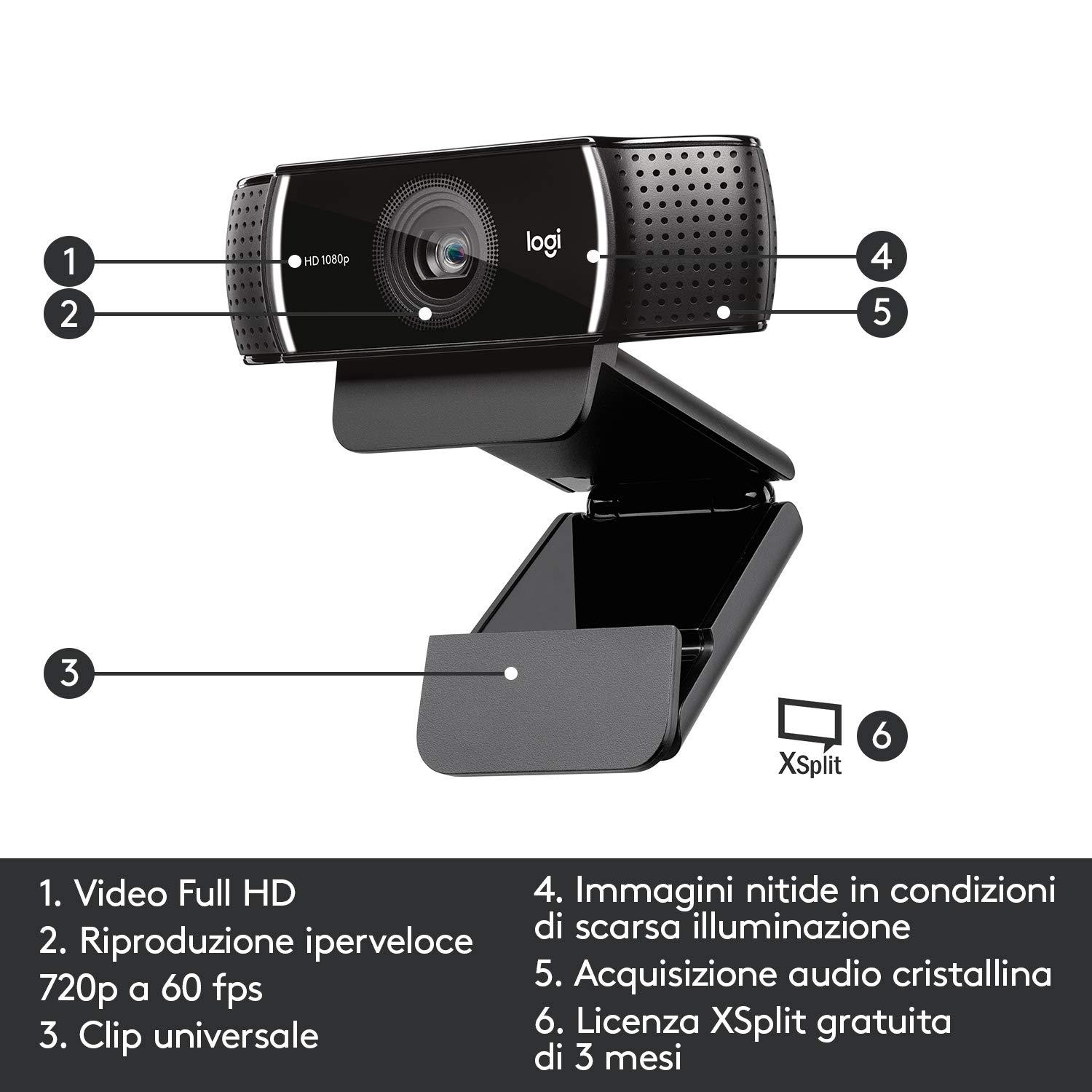 Logitech C922 Pro Stream Webcam, Streaming Hyperfast HD 1080p/30fps o HD 720p/60fps, Correzione Luce HD, Autofocus, Audio Stereo, Per YouTube, Twitch, XSplit, PC/Mac/Laptop/Macbook/Tablet - Nero