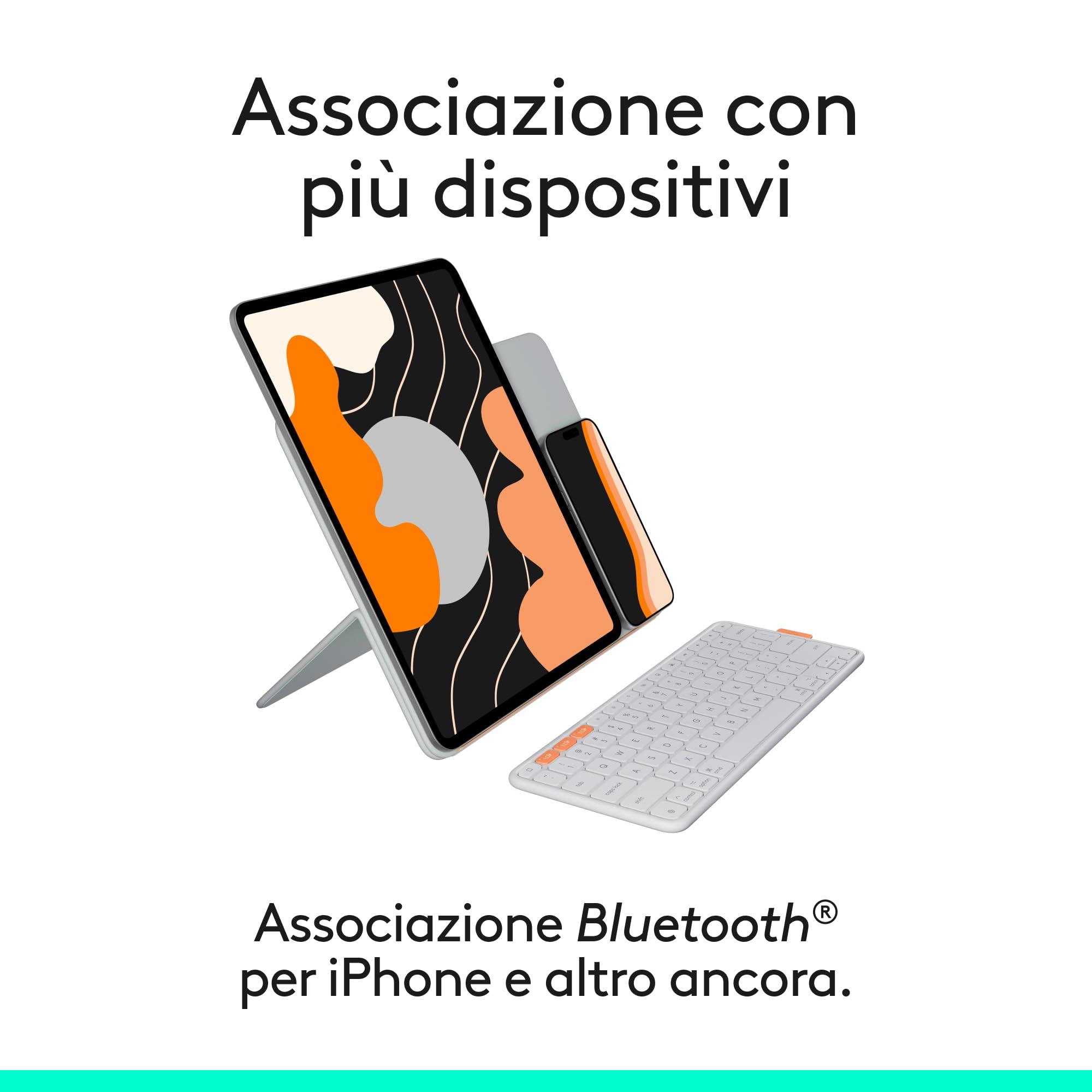 - Associa più dispositivi: associazione Bluetooth per iPhone e non solo; multitasking su tre dispositivi con una sola tastiera; passaggio da uno all’altro semplicemente premendo un pulsante
