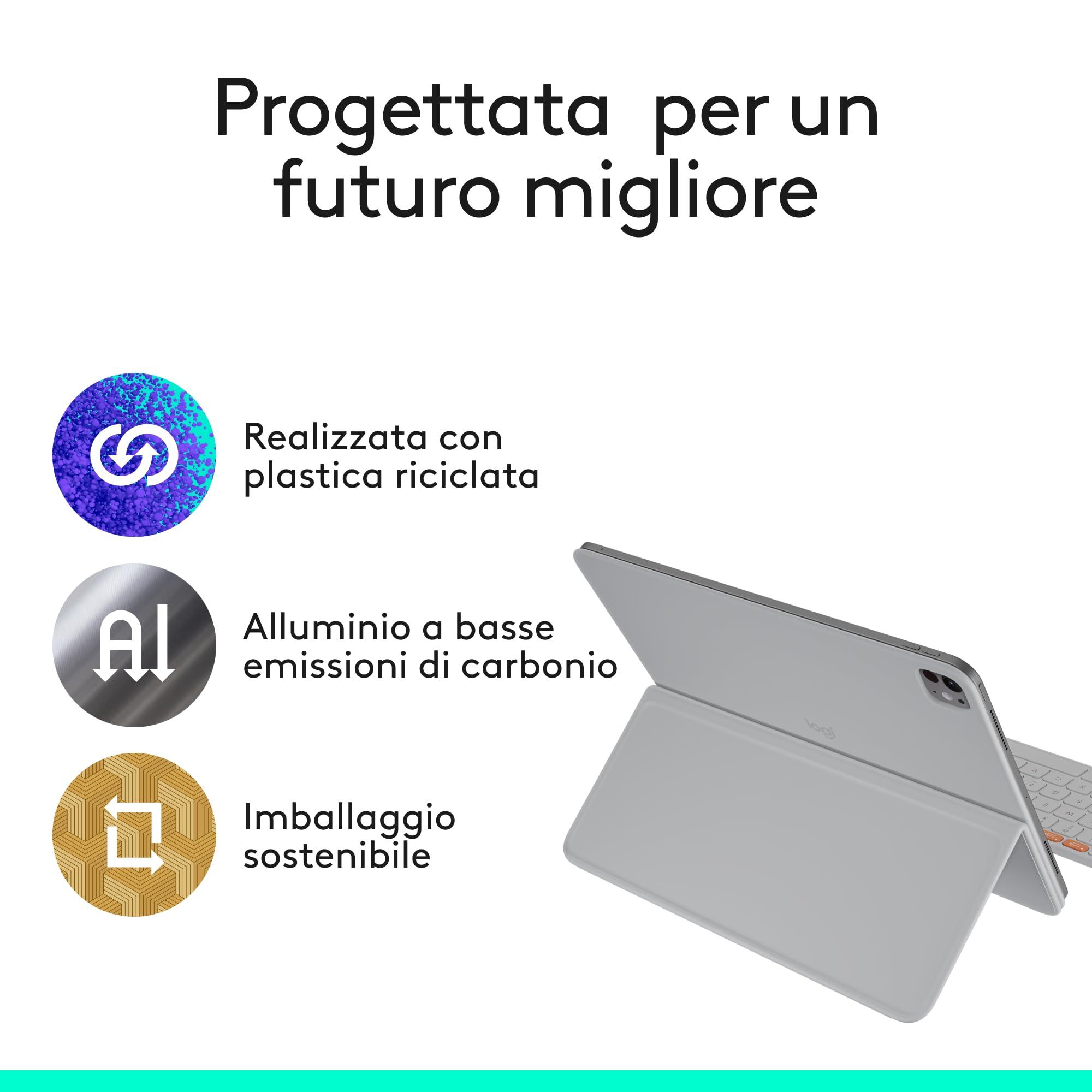 - Realizzato con plastica riciclata: le parti in plastica di Flip Folio sono realizzate in plastica riciclata post-consumo certificata (Graphite, Pale Grey: 38%)*