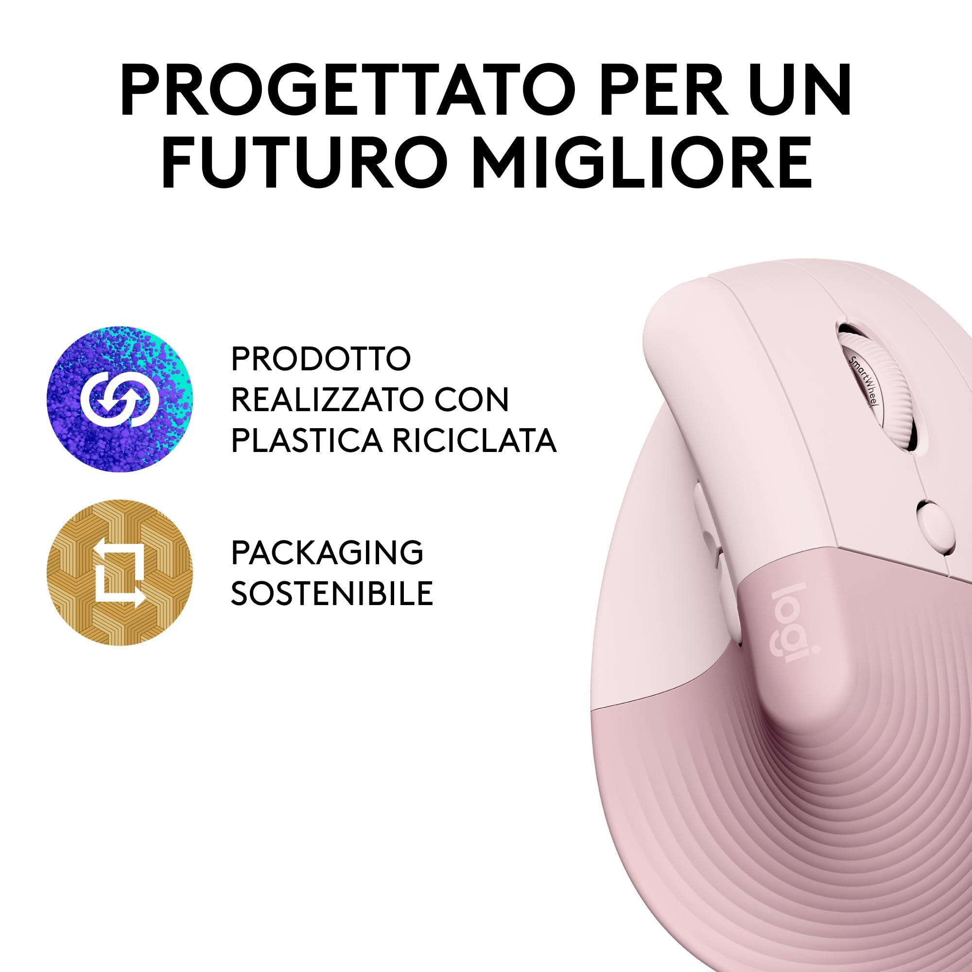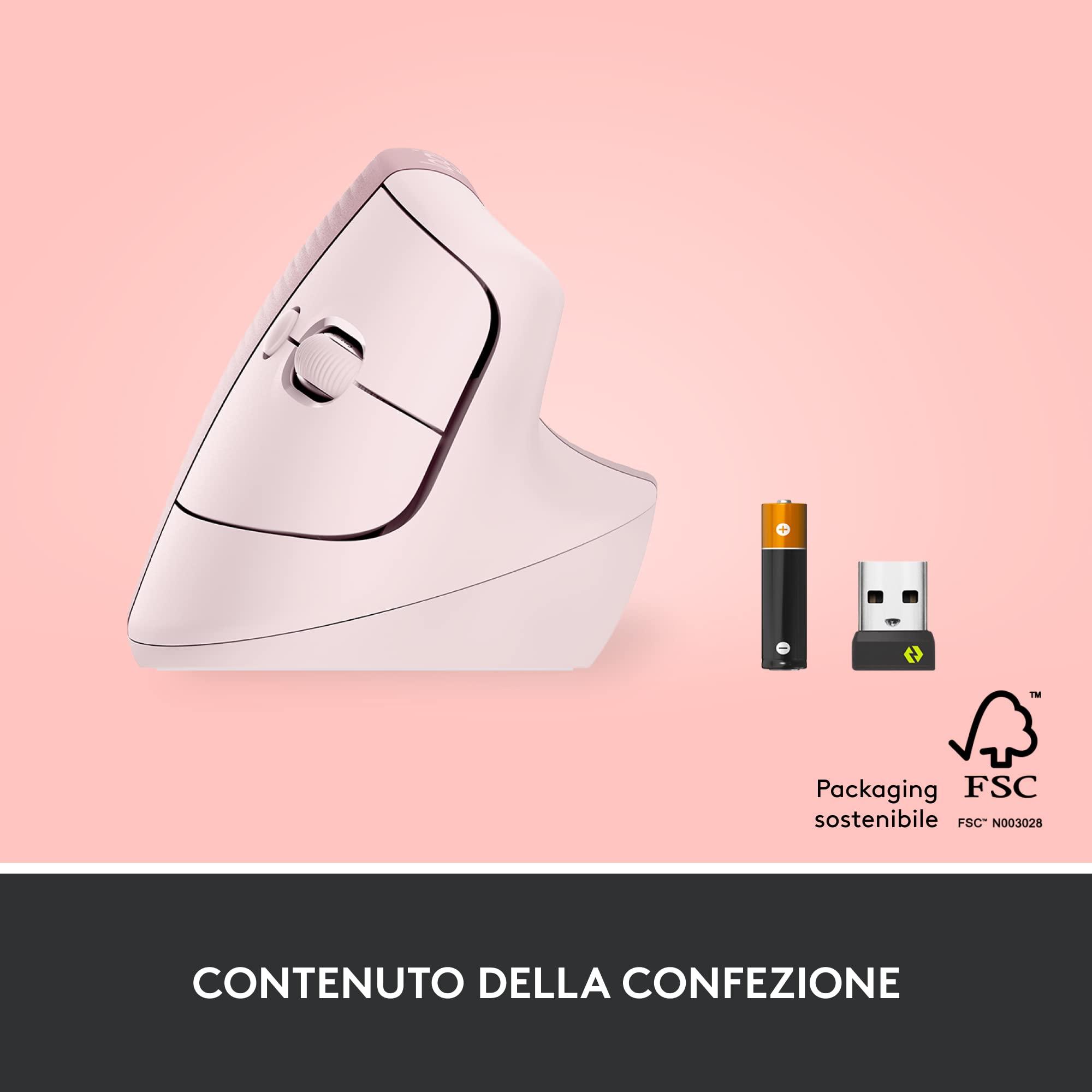 Logitech Lift Mouse Ergonomico Verticale, Senza Fili, Ricevitore Bluetooth o Logi Bolt USB, Clic Silenziosi, 4 Tasti, Compatibile con Windows / macOS / iPadOS, Laptop, PC - Rosa