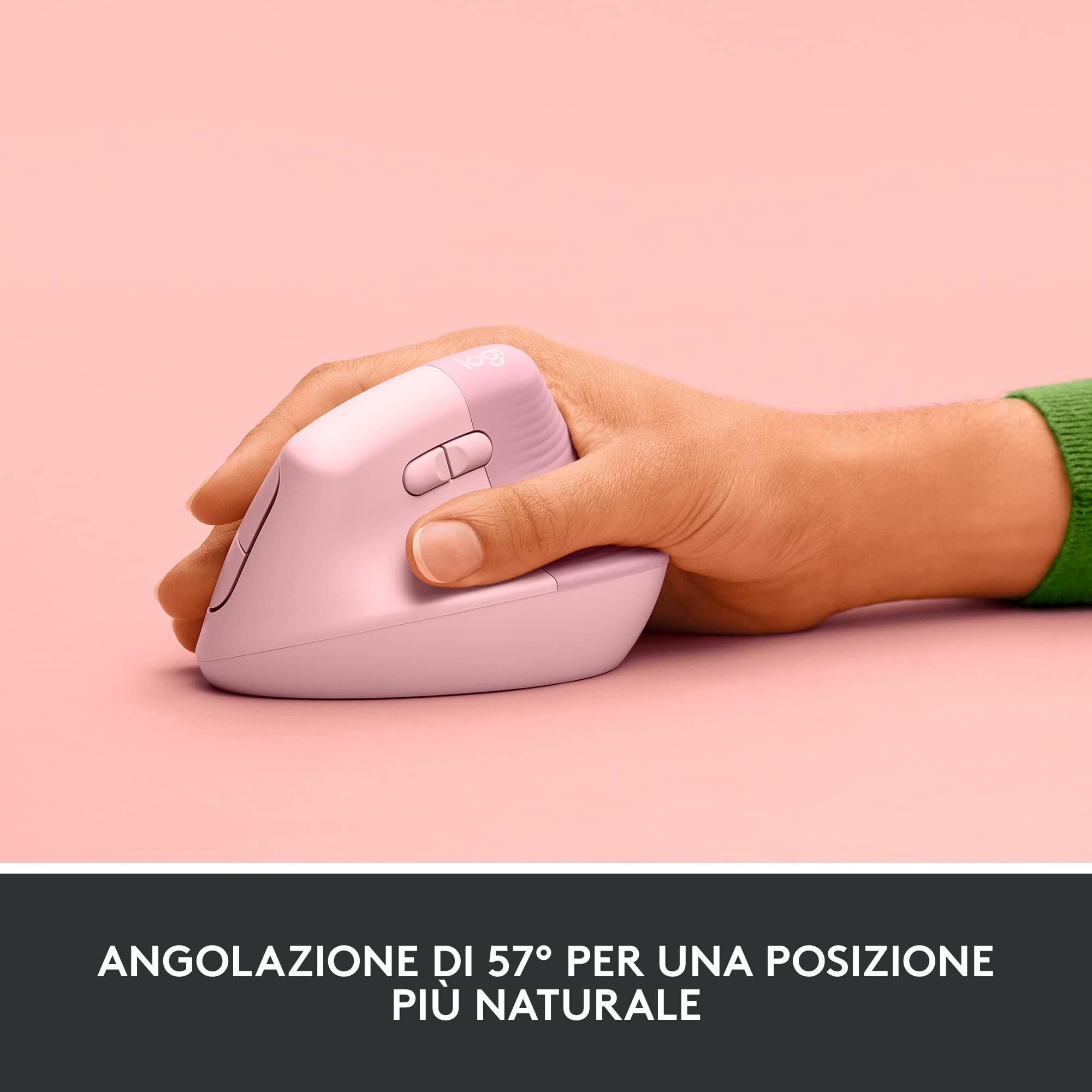 Logitech Lift Mouse Ergonomico Verticale, Senza Fili, Ricevitore Bluetooth o Logi Bolt USB, Clic Silenziosi, 4 Tasti, Compatibile con Windows / macOS / iPadOS, Laptop, PC - Rosa