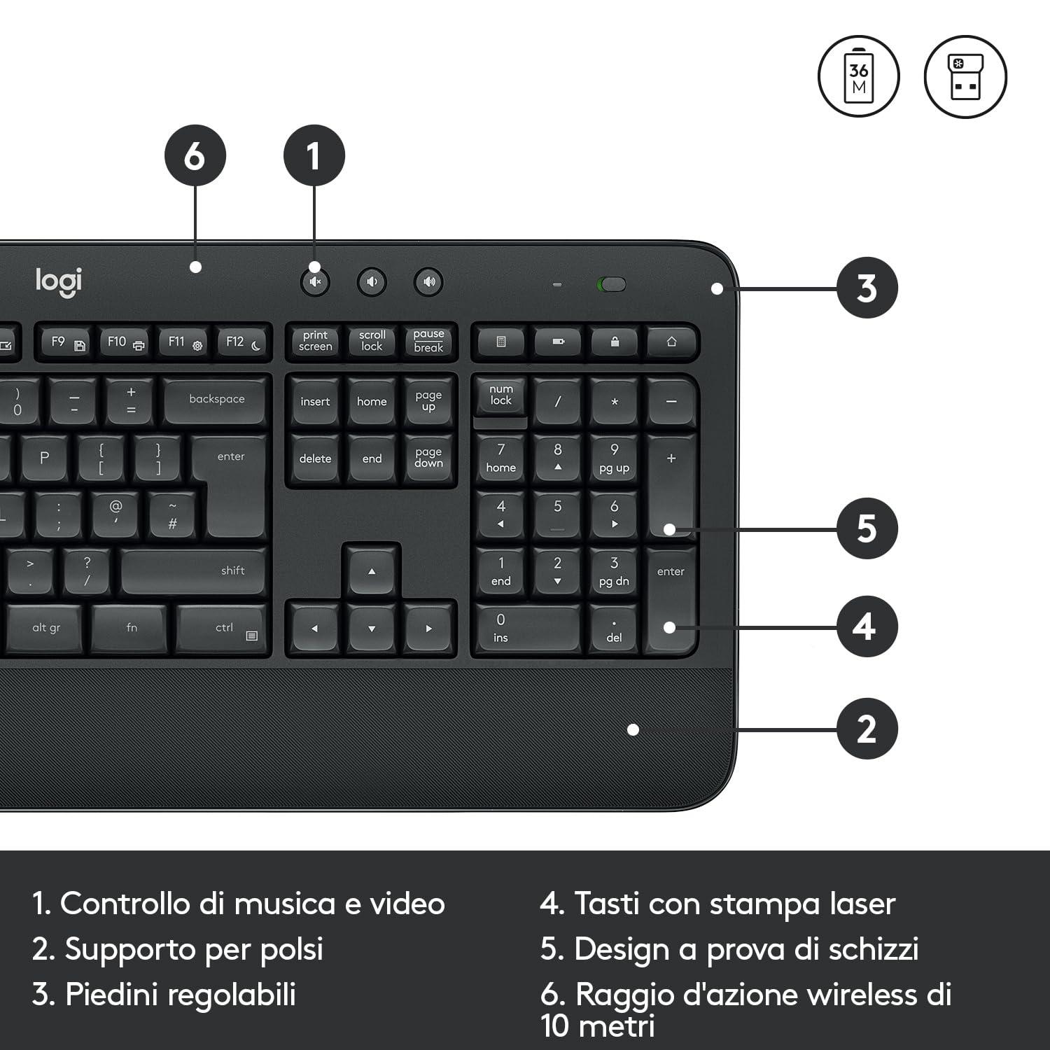 - PRODUTTIVITÀ AVANZATA SULLA PUNTA DELLE DITA – I tasti dedicati pratici ed essenziali offrono un accesso diretto ai dispositivi multimediali, alla calcolatrice e alle funzioni di controllo della batteria. Le scelte rapide preimpostate con i tasti Funzione possono essere personalizzate in Logitech Options per soddisfare qualsiasi flusso di lavoro.