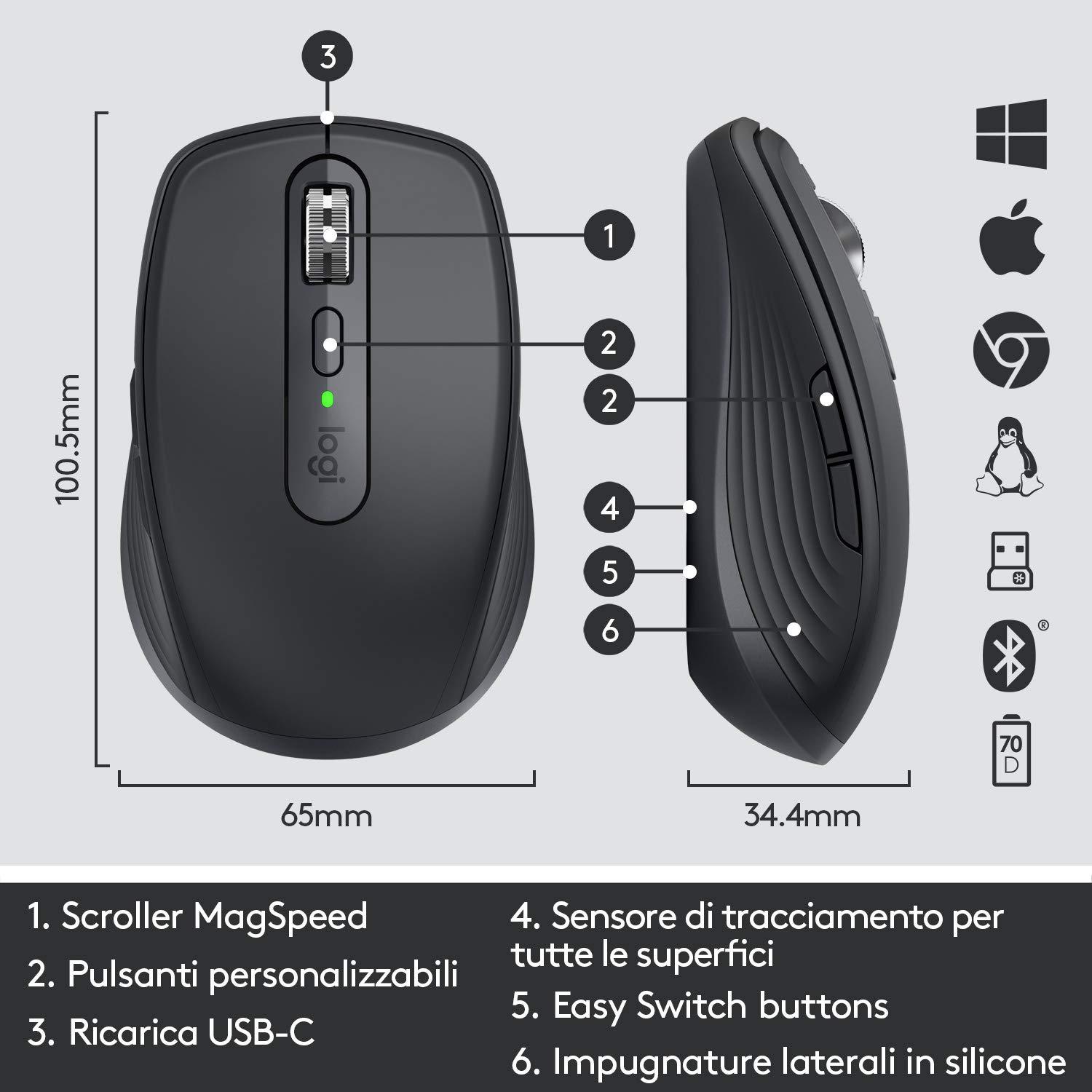 - DESIGN PREMIUM: MX Anywhere 3 è bello da vedere e facile da usare grazie allo scroller in acciaio lavorato, alle impugnature laterali in morbido silicone e a tre colori super moderni