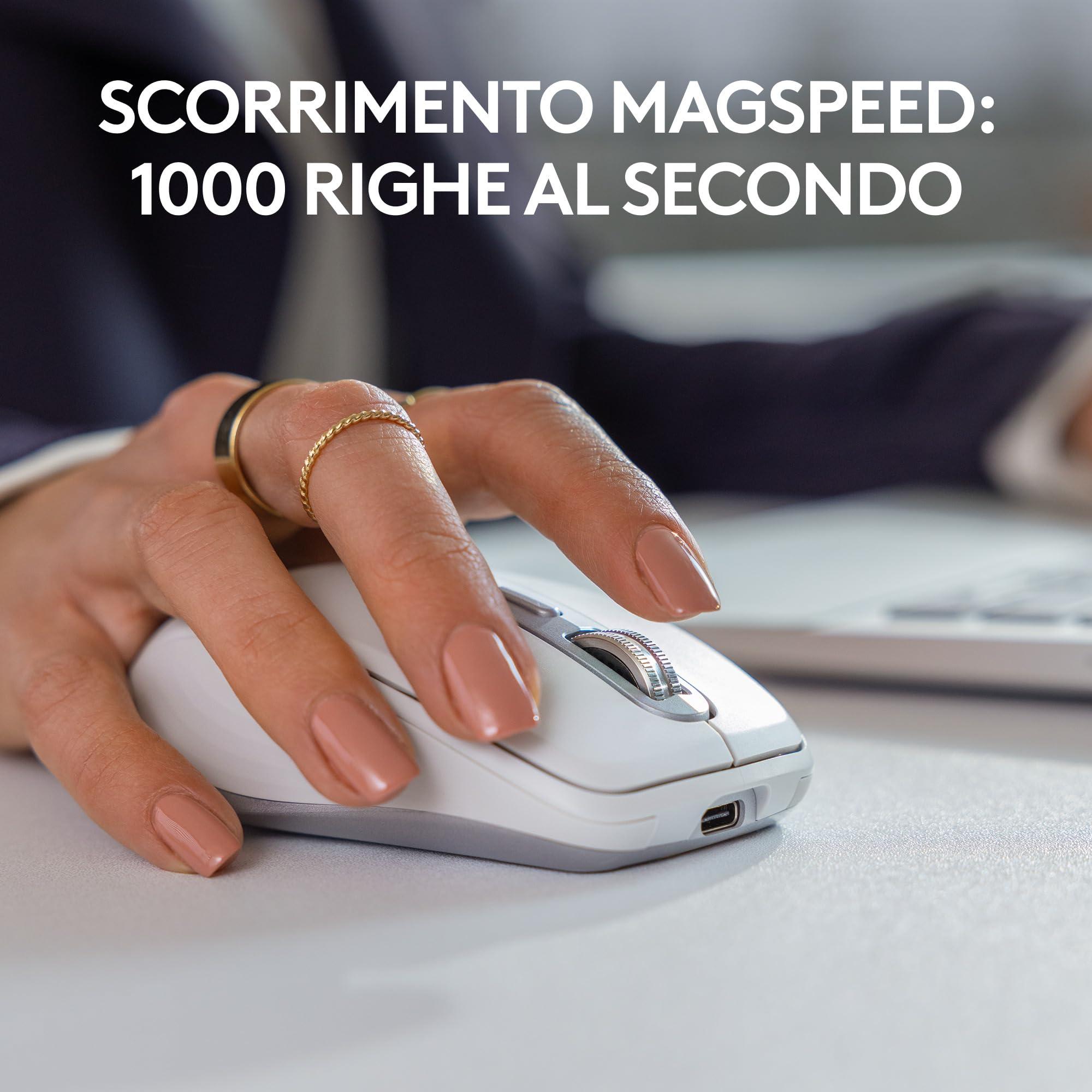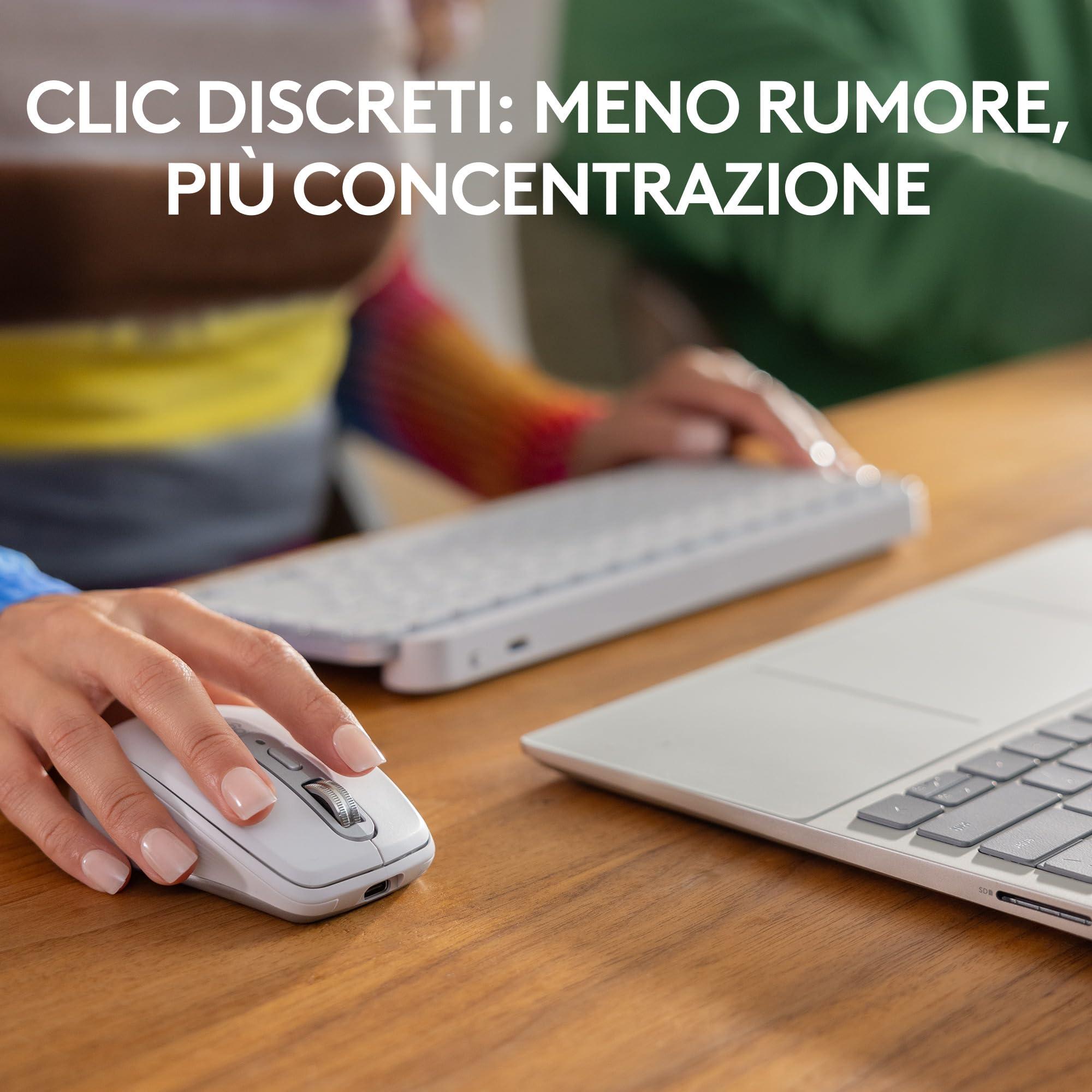 - Mouse con clic silenzioso: Stessa soddisfazione ma con meno rumore (rispetto al mouse wireless MX Anywhere 3), per una maggiore concentrazione.