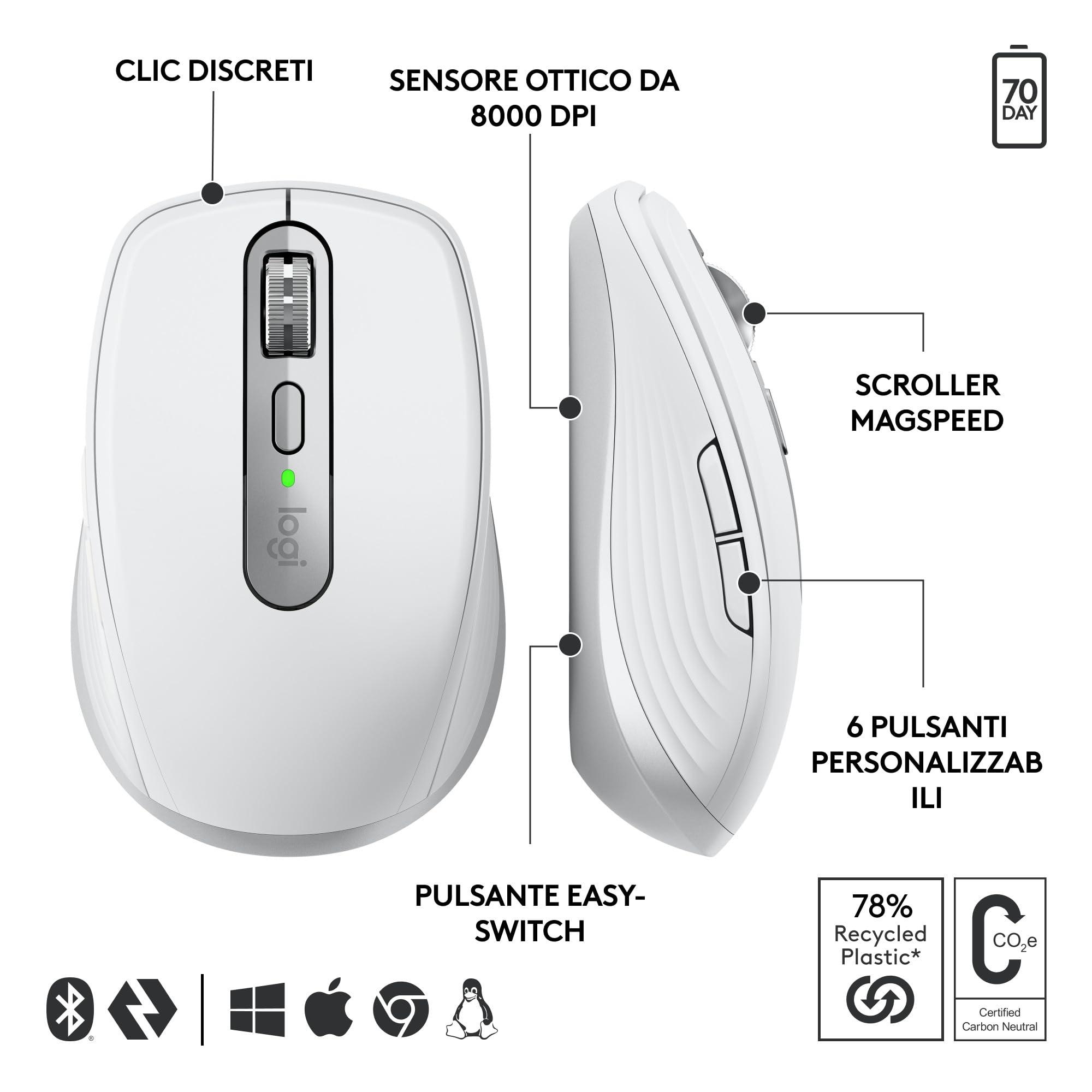- Realizzato con plastica riciclata: Il mouse per computer MX Anywhere 3S include parti in plastica riciclata post-consumo certificata (78% per Graphite e 61% per Pale Grey) (5).