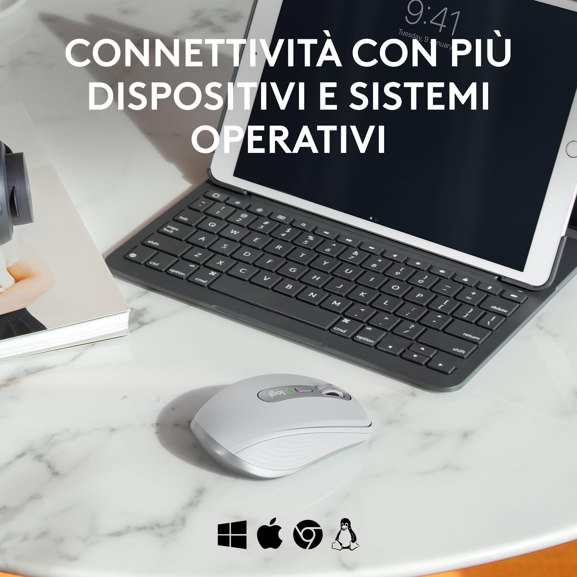 - Mouse con clic silenzioso: Stessa soddisfazione ma con meno rumore (rispetto al mouse wireless MX Anywhere 3), per una maggiore concentrazione.
