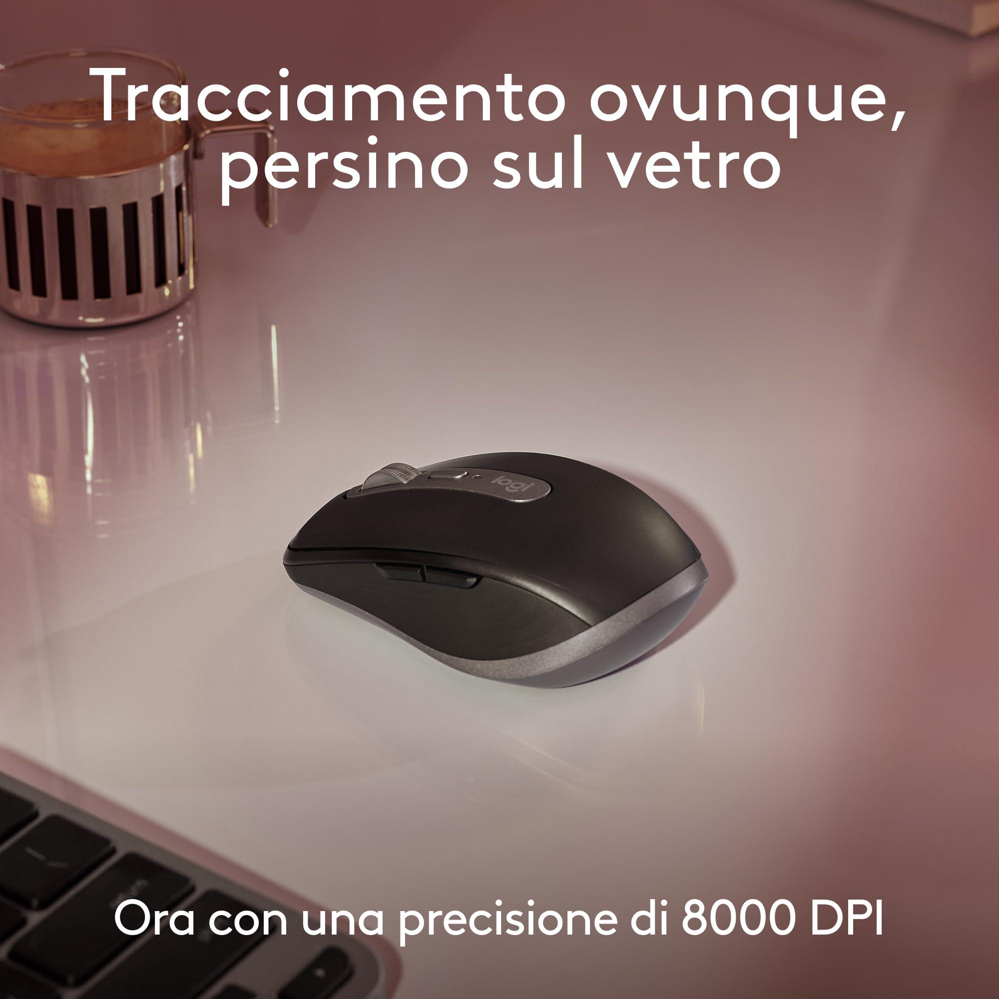 Logitech MX Anywhere 3S for Mac, mouse wireless Bluetooth compatto, tracciamento a 8000 DPI su qualsiasi superficie, clic discreti, USB-C, per MacBook Air, iMac, iPad - Spazio grigio