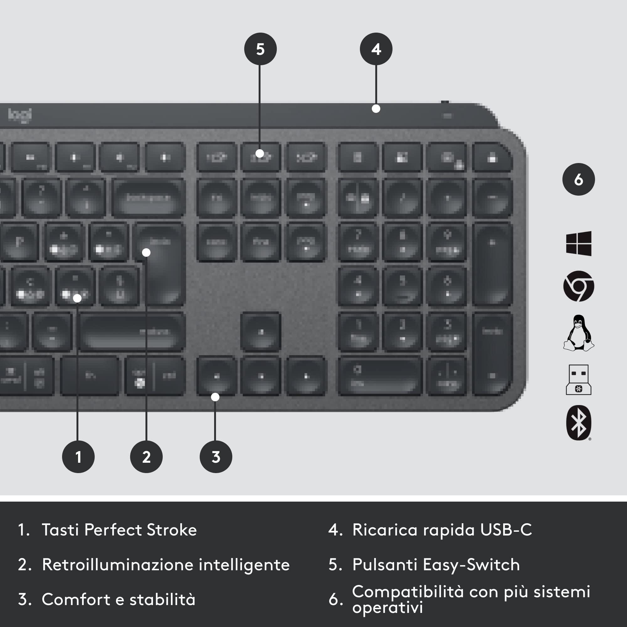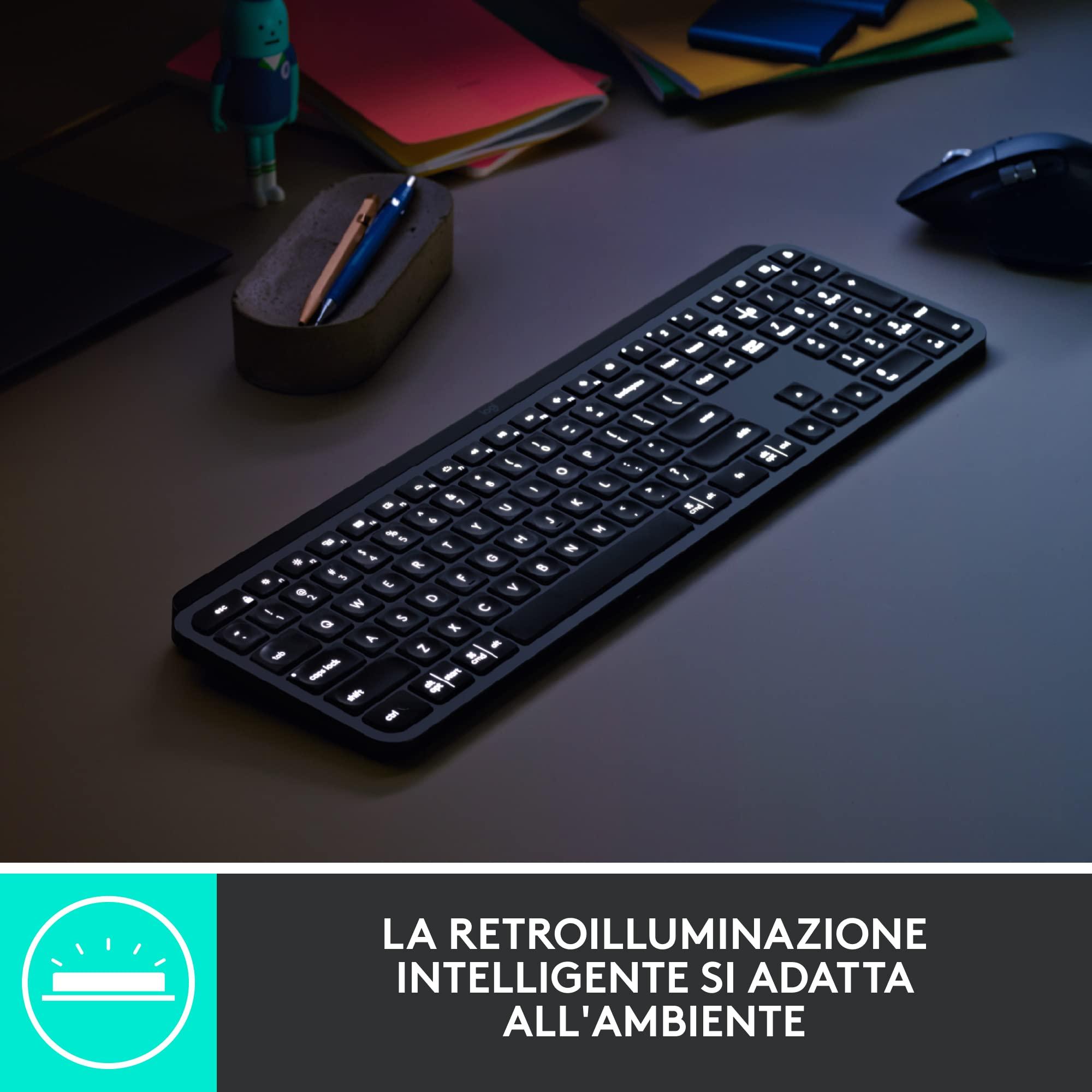 Logitech MX Keys Advanced for Business - Tastiera wireless illuminata, ricevitore USB Logi Bolt, Bluetooth, tasti retroilluminati, ricaricabile, Windows/Mac/Linux, layout QWERTY Italiano - Grafite