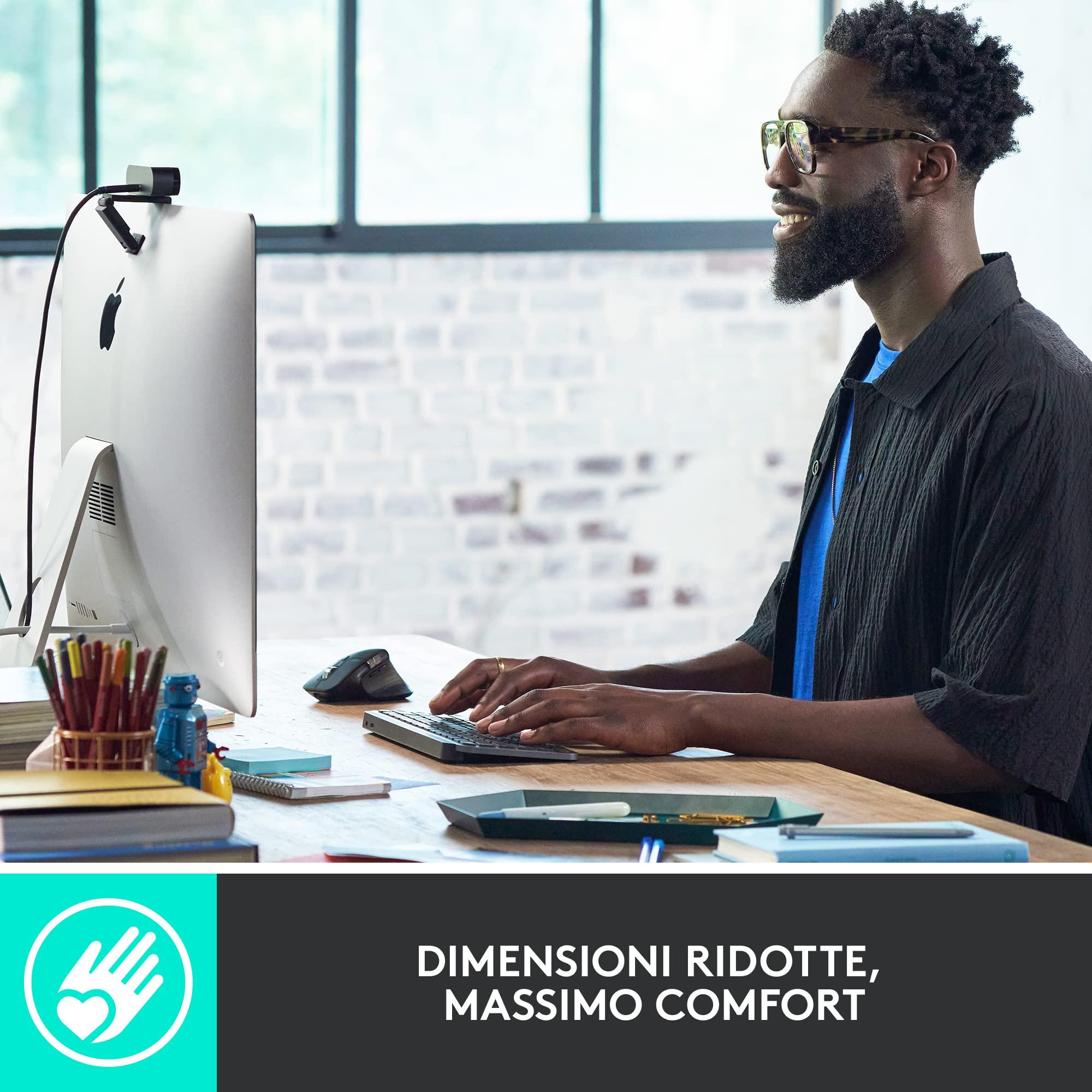 - Compatibile con più dispositivi e sistemi operativi: associala tramite ricevitore USB Logi Bolt o Bluetooth Low Energy a tre dispositivi e passa facilmente dall'uno all'altro premendo un pulsante