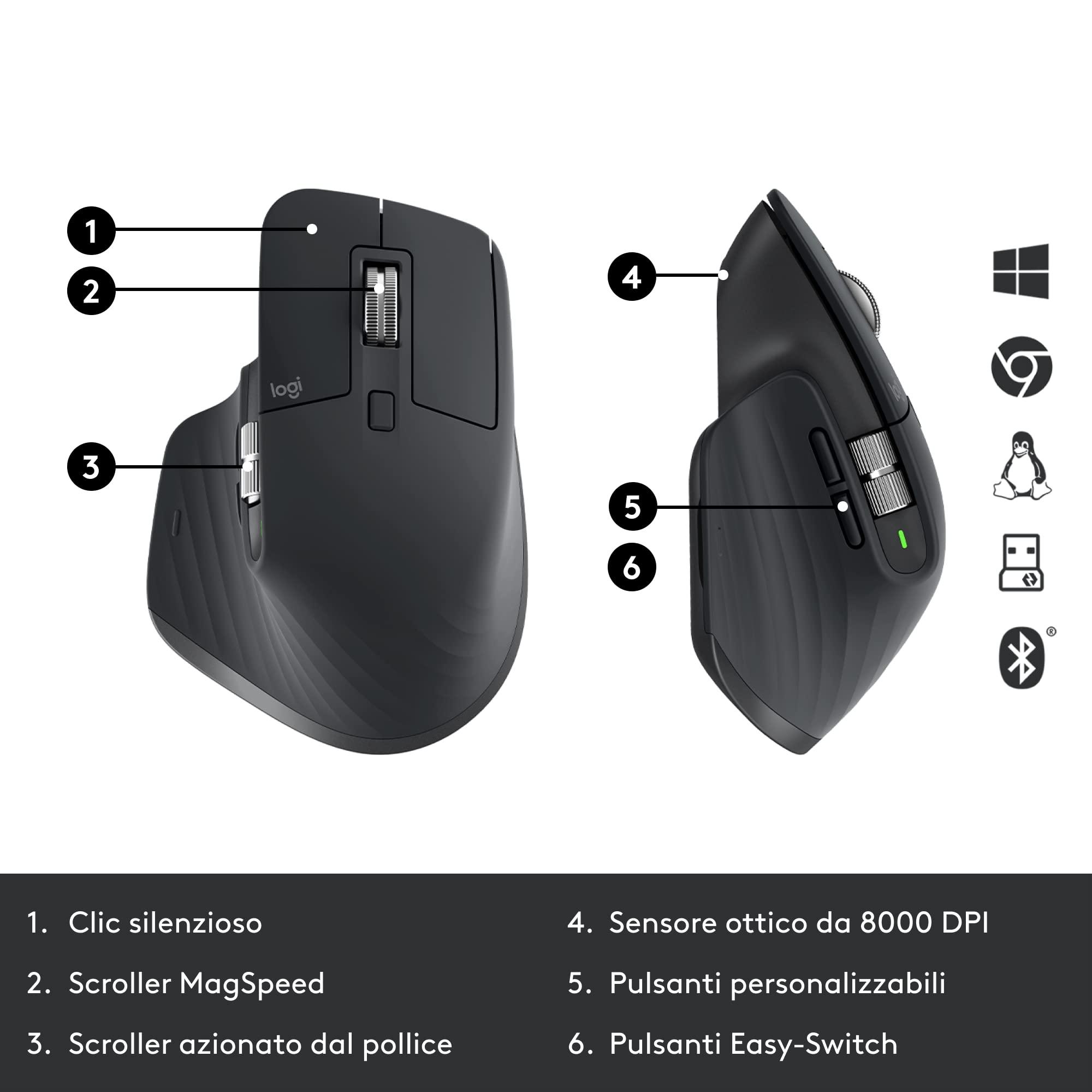 - Scorrimento MagSpeed: MX Master 3S consente di scorrere 1000 righe di codice o celle di un foglio di calcolo in un solo secondo e di ottenere una precisione pixel per pixel, riga per riga