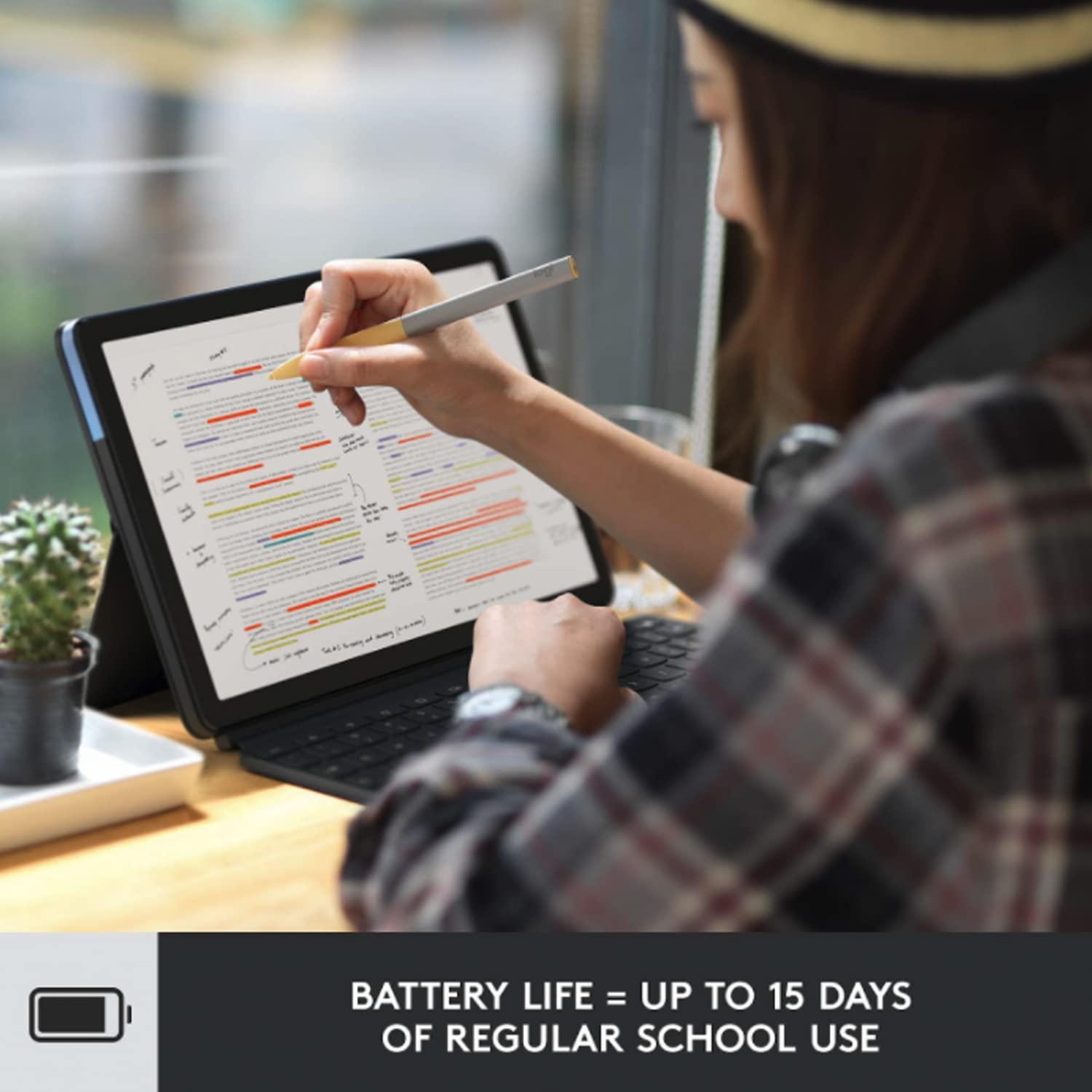 - Grazie all’associazione automatica, gli studenti possono iniziare a scrivere subito. Logitech Pen si ricarica facilmente tramite il cavo USB-C utilizzato dagli studenti con i Chromebook e offre una durata della batteria fino a 15 giorni.