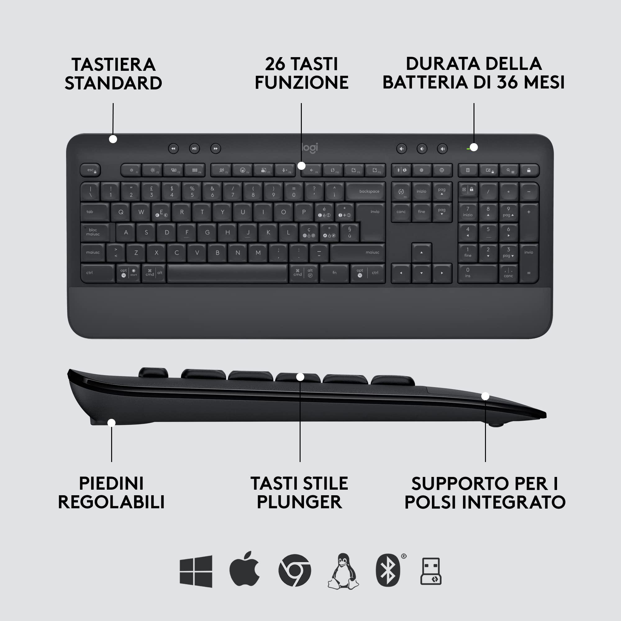 - Lunga durata della batteria: Il Signature MK650 Combo for Business include una batteria AA per il mouse che dura fino a 24 mesi e 2 batterie AA per la tastiera che durano fino a 36 mesi.