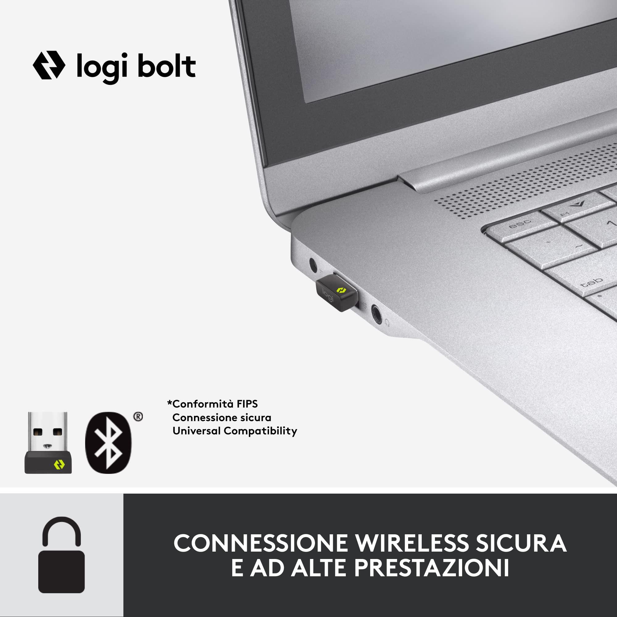 - Due modi per connettersi: Scegliete tra il ricevitore USB Logi Bolt quando la sicurezza è la priorità o la tecnologia wireless Bluetooth Low Energy quando è necessaria la flessibilità multipiattaforma.