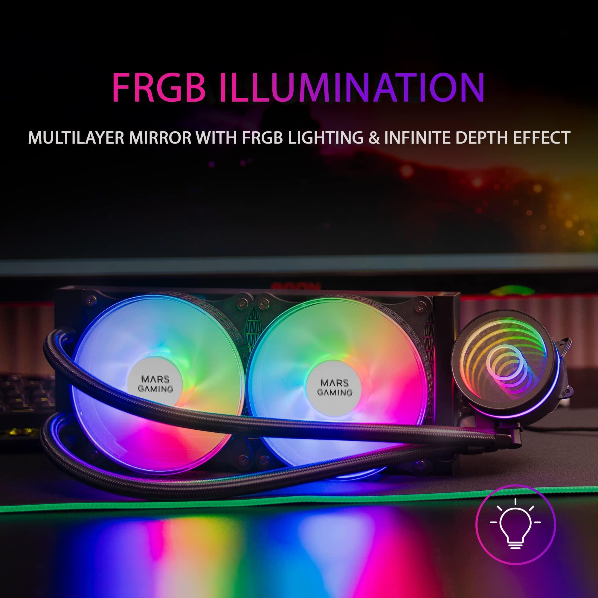 - SPECCHIO INFINITO CON ILLUMINAZIONE FRGB: Il blocco di raffreddamento ML-ONE240 è dotato di uno specchio multistrato con illuminazione Rainbow RGB fissa a 360 gradi* con effetto profondità infinita; *L'illuminazione del prodotto è fissa come mostrato nelle immagini, i colori non variano o cambiano posizione