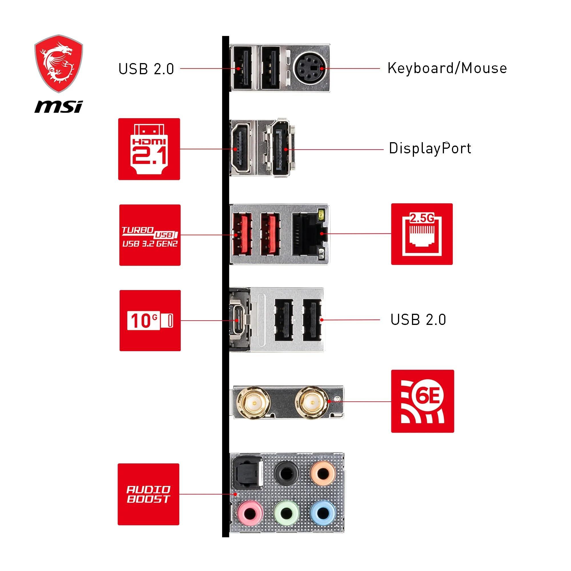 - CONNESSIONE WI-FI 6E – Modulo Intel Wi-Fi 6E con Bluetooth 5.3 e LAN 2.5Gbps; porte posteriori USB 3.2 Gen 2 Type-C/Type-A (10Gbps), HDMI 2.1, DisplayPort 1.4 e audio 7.1 HD con Audio Boost e uscita S/PDIF