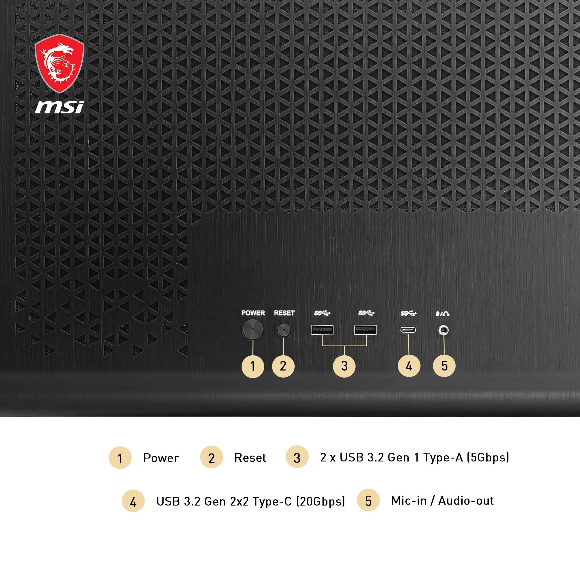 - PANNELLO I/O: Il pannello I/O situato nella parte anteriore del pannello superiore include i pulsanti di accensione e reset, jack per microfono e audio, una porta USB 3.2 Gen 2x2 Type-C (20Gbps) e 2 porte USB 3.2 Gen 1 Type-A (5Gbps).