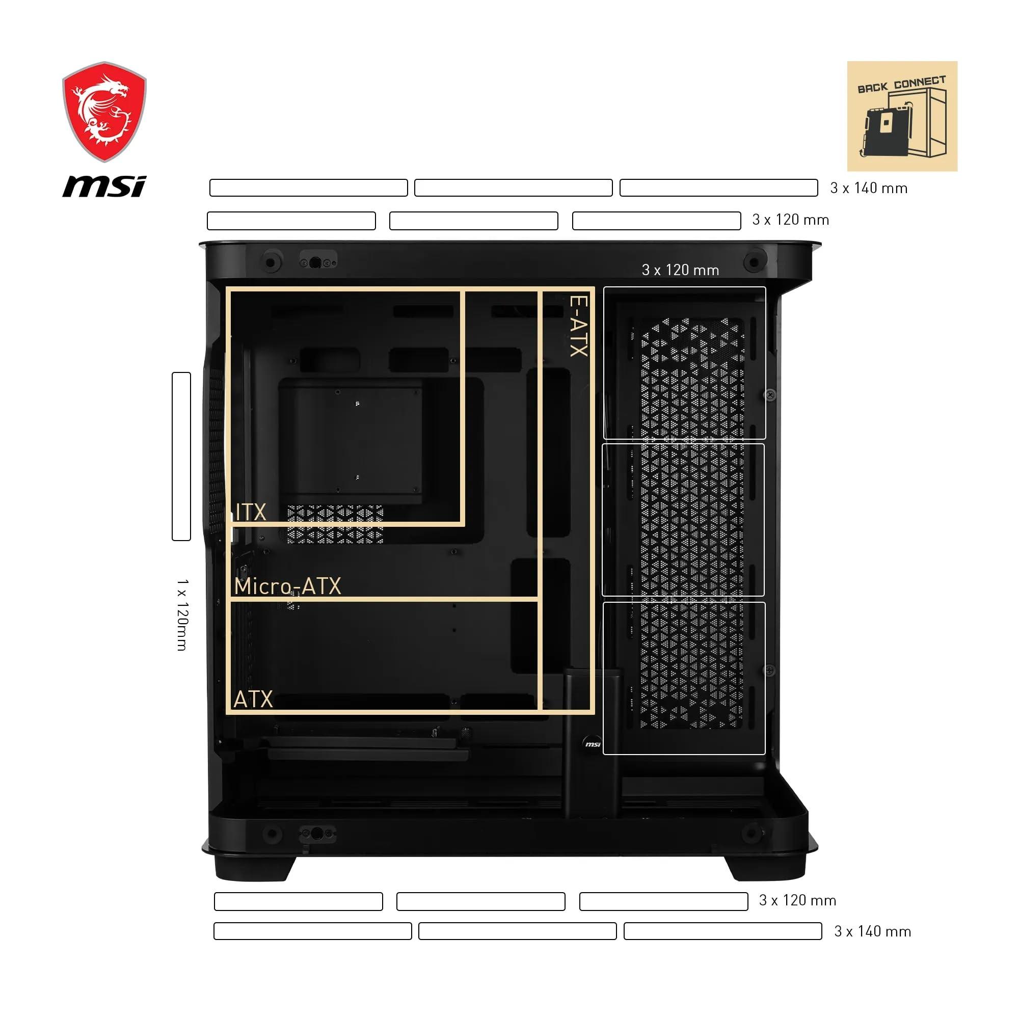 - Il MEG MAESTRO 700L PZ è un case per PC perfetto per schede madri ATX, Micro-ATX e Mini-ITX o Back-connect ATX standard. È anche compatibile con schede madri E-ATX fino a 305 x 280 mm. Le dimensioni del case sono 470 x 300 x 474 mm.
