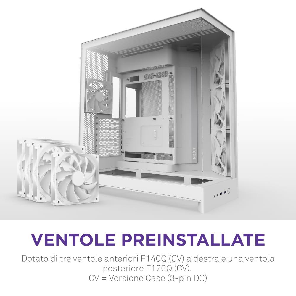 - VENTOLE PREINSTALLATE — Include tre ventole F140Q (CV) nella parte anteriore-destra e una ventola F120Q (CV) nella parte posteriore. CV = Versione del Case (3-pin DC)