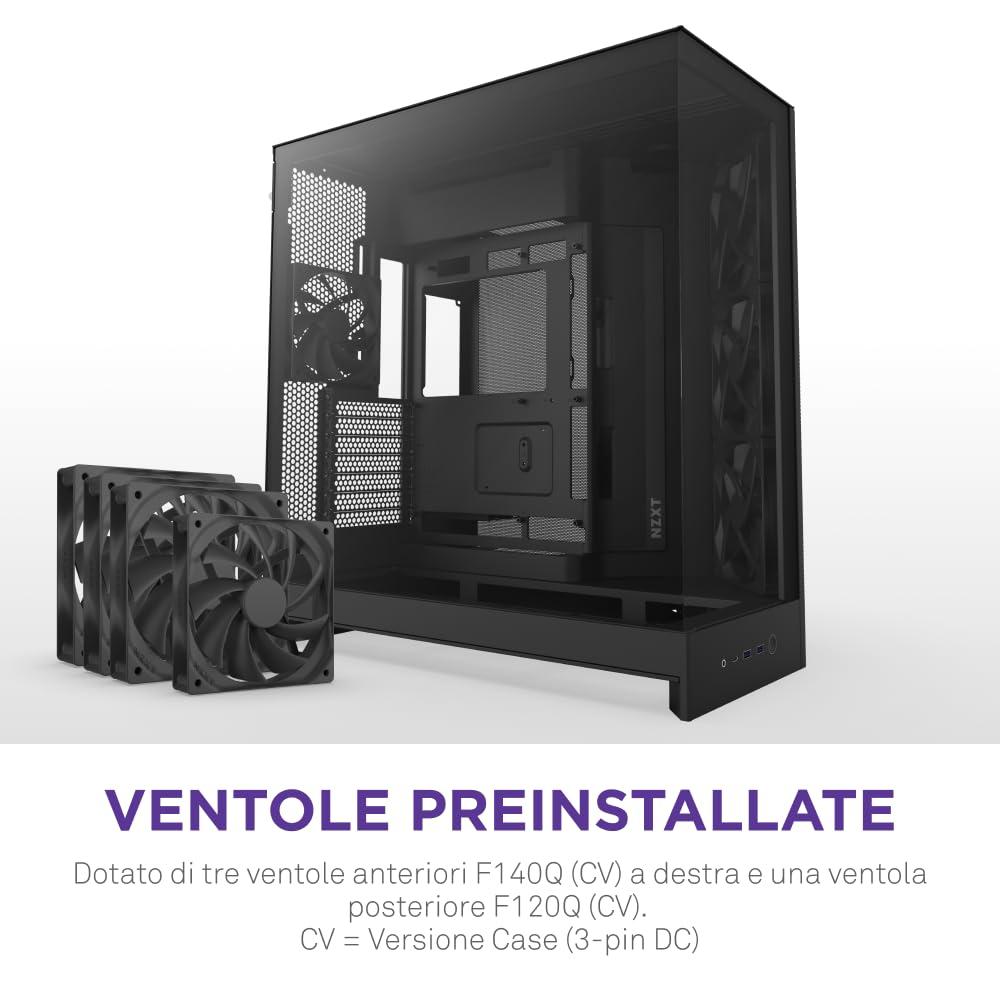 - VENTOLE PREINSTALLATE — Include tre ventole F140Q (CV) nella parte anteriore-destra e una ventola F120Q (CV) nella parte posteriore. CV = Versione del Case (3-pin DC)
