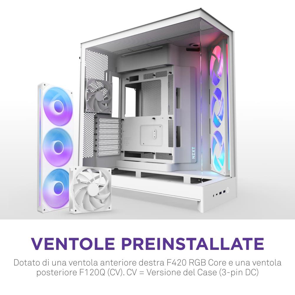 - VENTOLE PREINSTALLATE — Include un'unità di ventola singola F420 RGB Core nella parte anteriore destra e una ventola F120Q (CV) nella parte posteriore. CV = Versione del Case (3-pin DC)