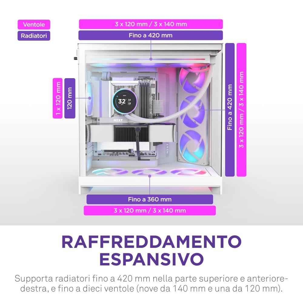 - CAPACITÀ DI DIECI VENTOLE — Supporta fino a nove ventole da 140 mm nella parte superiore, anteriore-destra e inferiore, più una ventola da 120 mm nella parte posteriore.