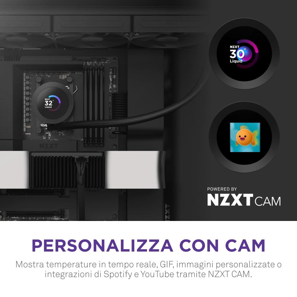 - SCHERMO LCD PERSONALIZZATO — Visualizza le temperature di sistema in tempo reale, GIF animate, immagini personalizzate o integrazioni web come Spotify e YouTube su un LCD 1,54" — completamente personalizzabile tramite software NZXT CAM.
