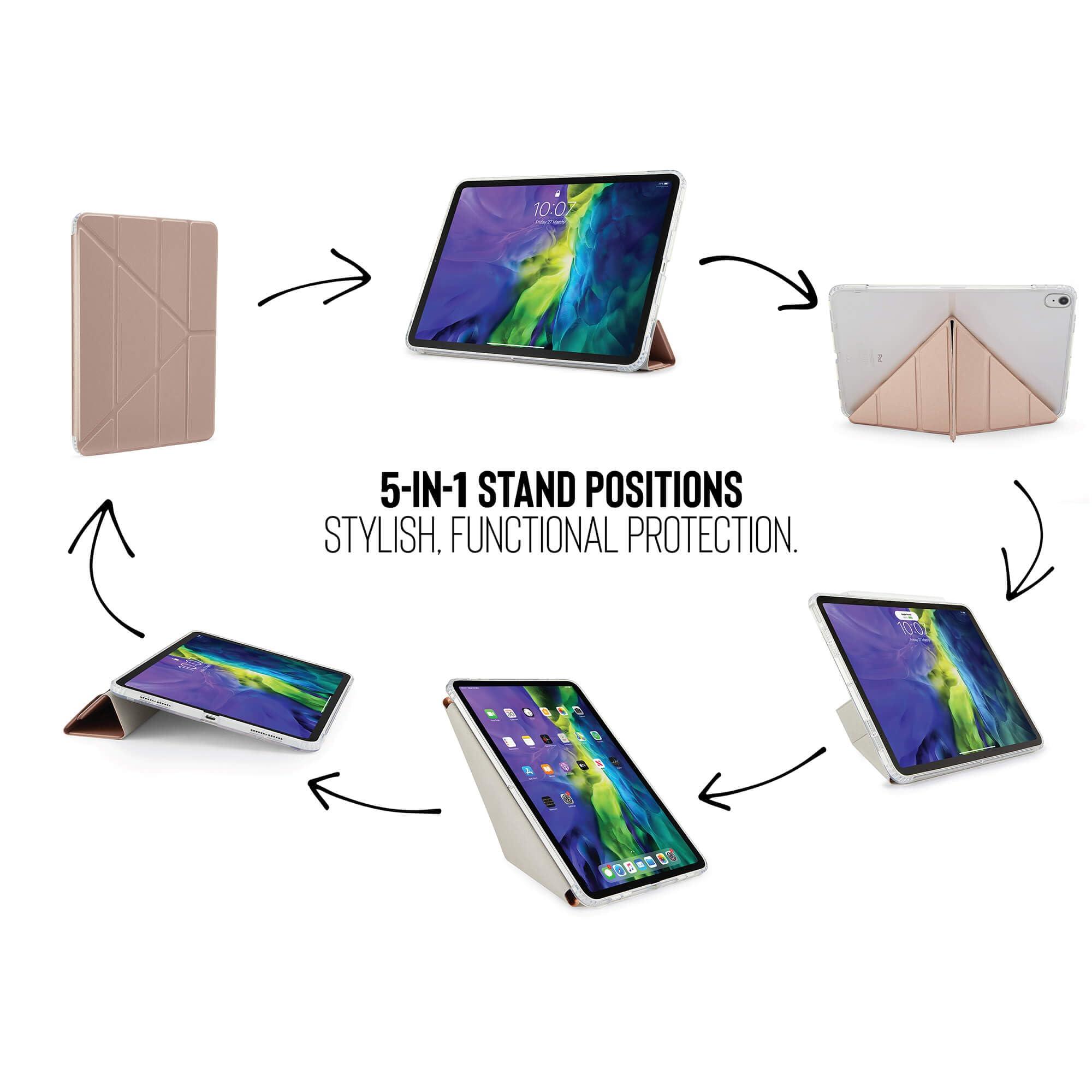 Ha anche la nostra versatile copertina pieghevole 5 in 1 per origami di cui non vorrai vivere senza. Permette di piegare facilmente la cover anteriore e posizionare l'iPad in: