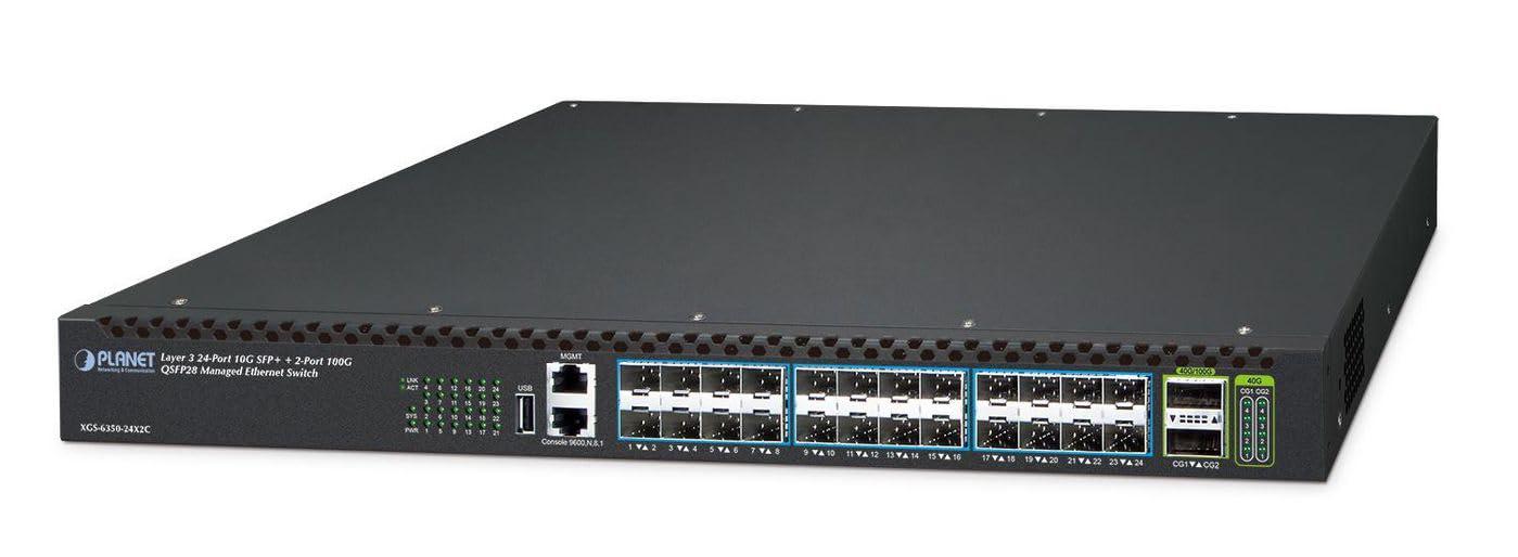 Planet Layer 3 24 porte 10G SFP+ + 2 porte 40G/100G QSFP28, W128945992 (switch gestito QSFP28 a 2 porte 40G/100G con alimentazione ridondante opzionale, impilamento hardware fino a 10 unità)