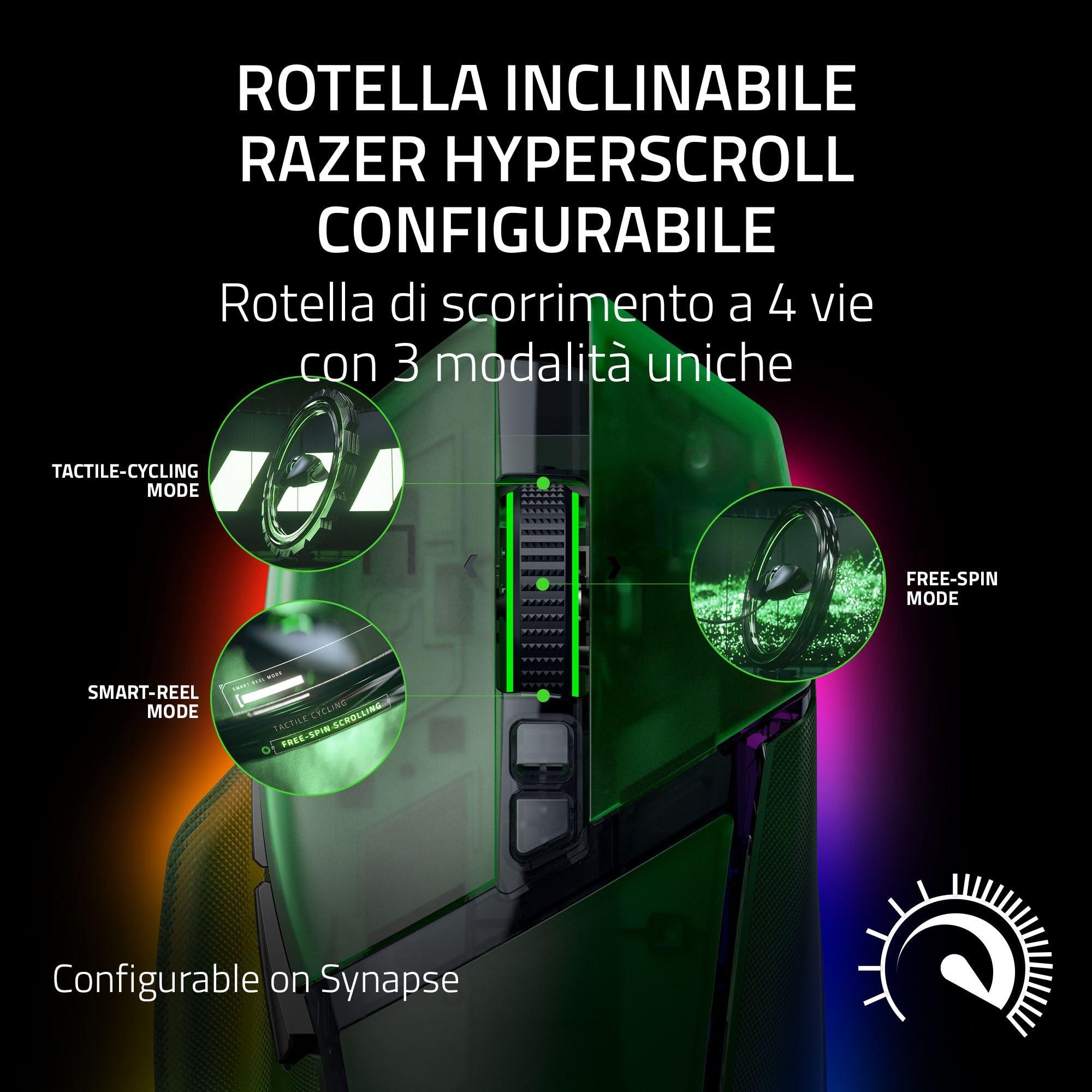 - Razer HyperScroll Tilt Wheel configurabile - Rotella di scorrimento a 4 vie con 3 modalità esclusive: Scegliete tra il ciclismo tattile e lo scorrimento fluido a rotazione libera, oppure passate automaticamente da una all'altra in base alla velocità di scorrimento in modalità Smart-Reel, ora configurabile su Synapse.