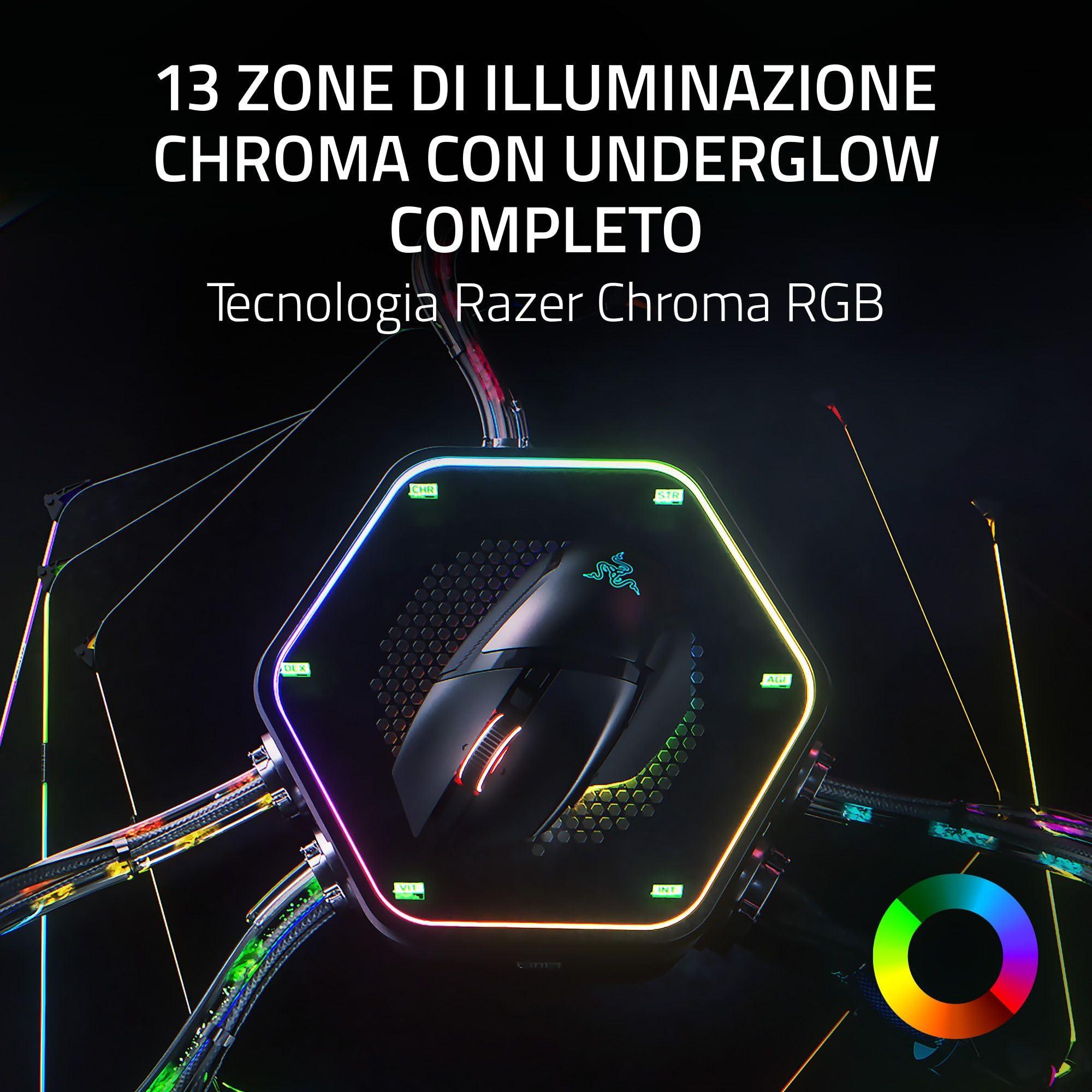 - Illuminazione Chroma a 13 zone con illuminazione completa - Grazie a Razer Chroma RGB: personalizzate ogni zona con oltre 16,8 milioni di colori e innumerevoli effetti di luce e sperimentate una maggiore immersione grazie alla reazione dinamica con oltre 200 giochi integrati in Chroma.