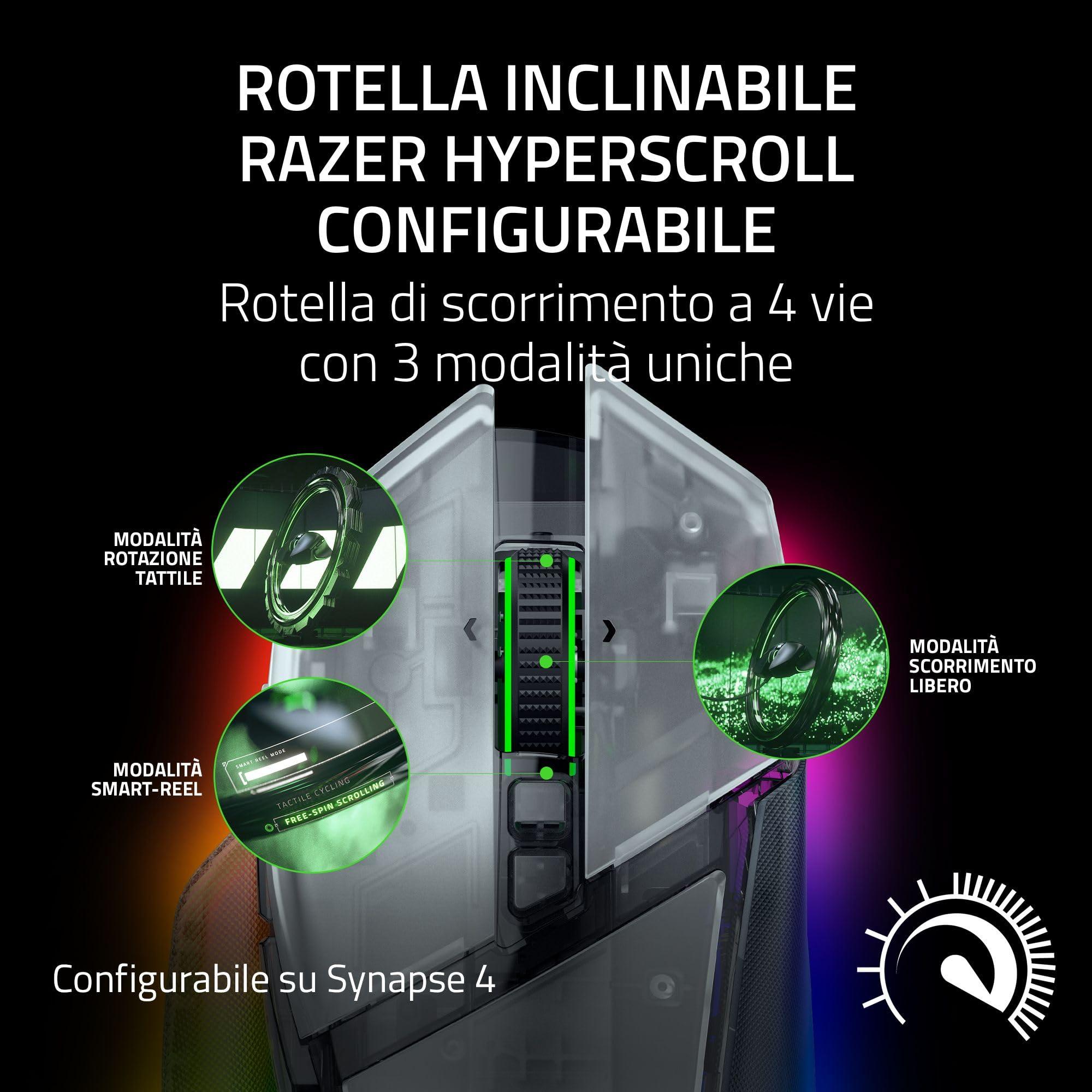 - Razer HyperScroll Tilt Wheel configurabile - Rotella di scorrimento a 4 vie con 3 modalità esclusive: Scegliete tra il ciclismo tattile e lo scorrimento fluido a rotazione libera, oppure passate automaticamente da una all'altra in base alla velocità di scorrimento in modalità Smart-Reel, ora configurabile su Synapse.