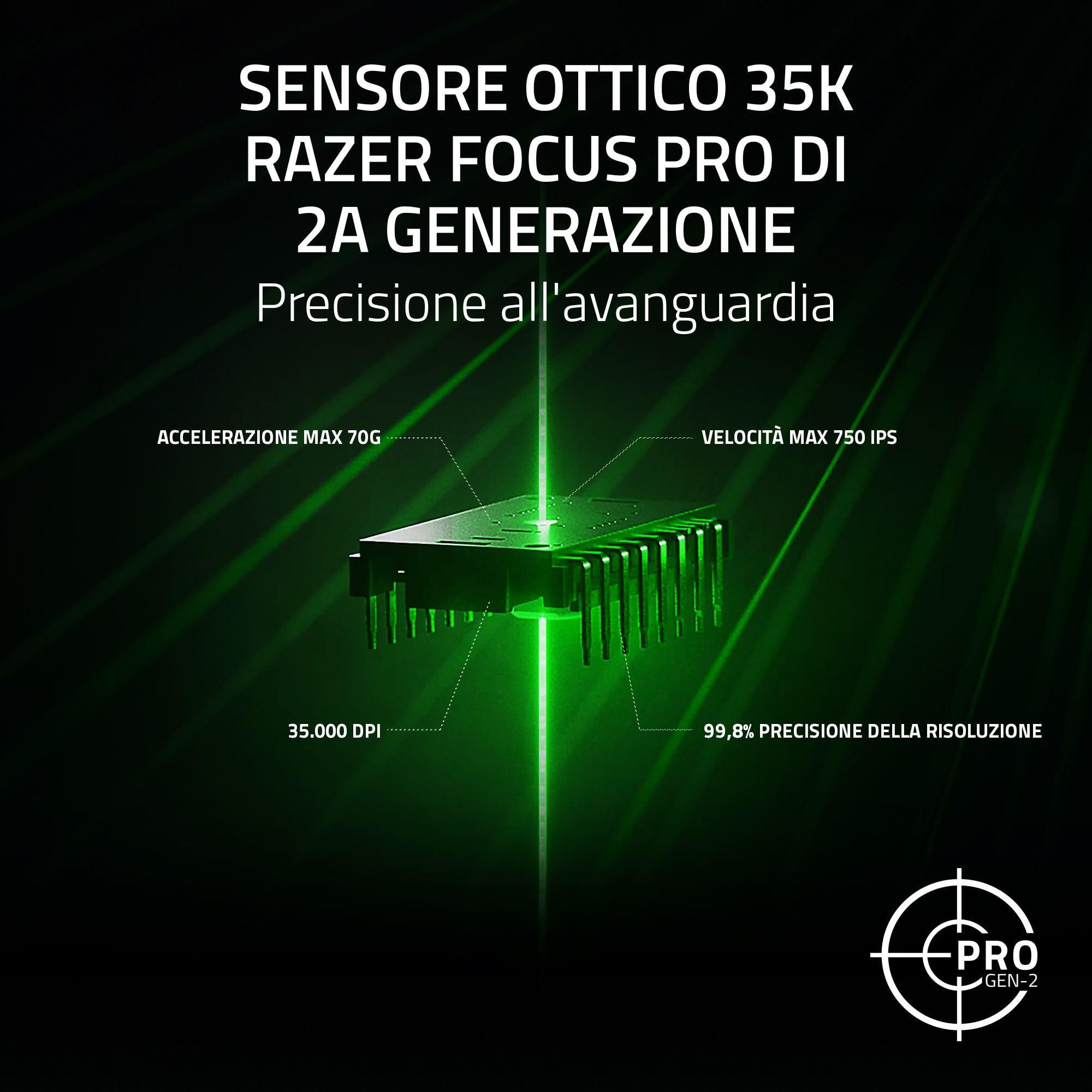 - Sensore ottico Razer Focus Pro 35K Gen-2 - La migliore precisione della categoria: Sperimentate le migliori prestazioni di tracciamento su un'ampia varietà di superfici, compreso il vetro, con il supporto di funzioni intelligenti e regolazioni a passi di 1-DPI per una mira e un controllo più granulari.