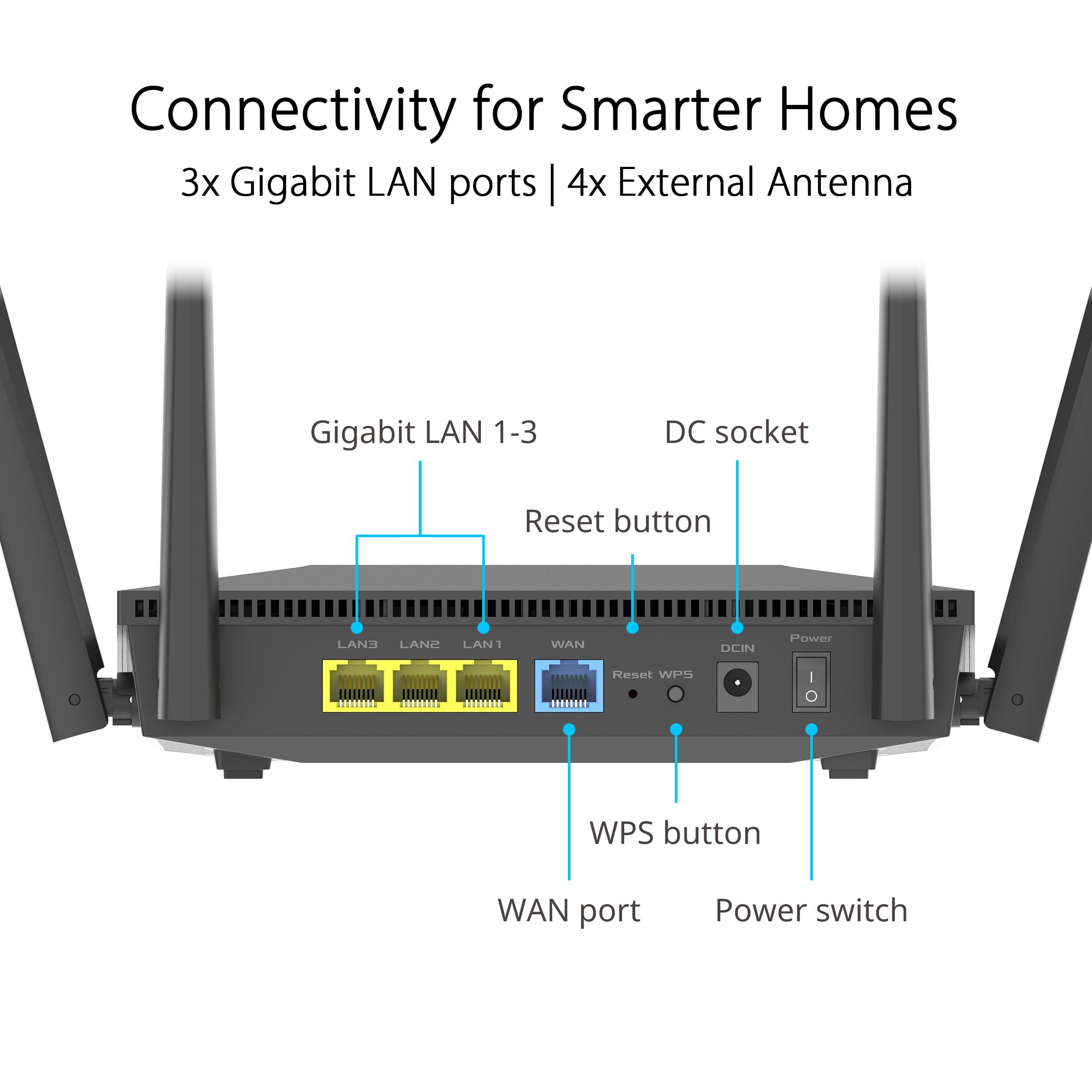 - Velocità wireless ultraveloce - RT-AX52 supporta 1024-QAM per connessioni wireless notevolmente più veloci Con una velocità di rete totale di circa 1800 Mbps — 574 Mbps nella banda da 2,4 GHz e 1201 Mbps nella banda da 5 GHz