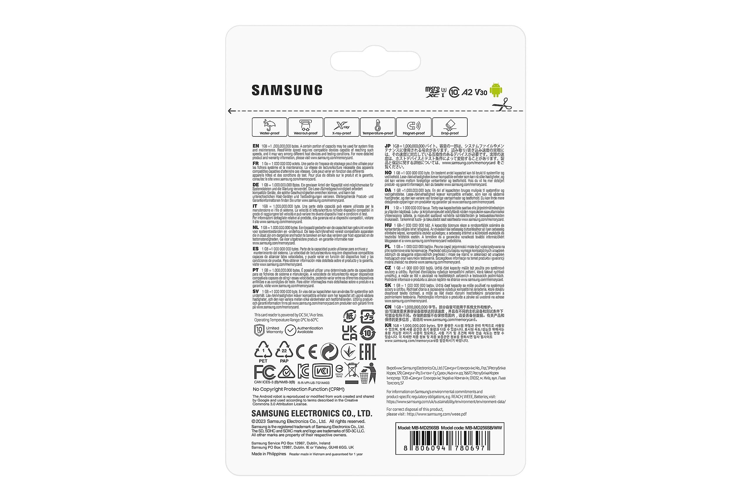 - Contenuto: 1x Samsung PRO Plus Memory Card MicroSD (MB-MD256SB), 256 GB, Incluso USB Card Reader, Dimensioni: 15 x 11 x 1 mm, Peso: 0,25 g, Colore: Blu
